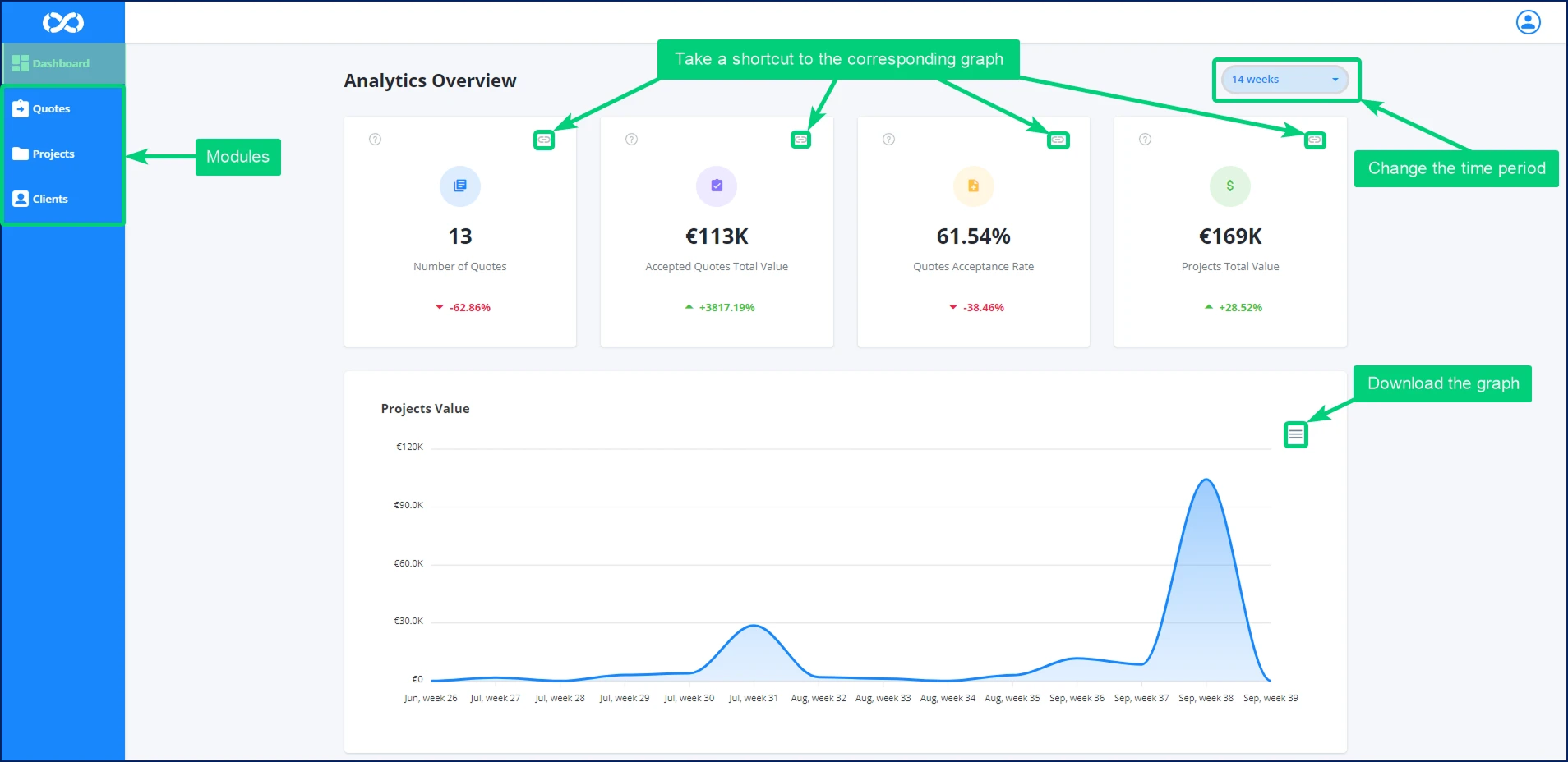 The system supports end-to-end project management, starting with quoting and project setup and continuing through task assignment, delivery, invoicing, and payment tracking. Quotes can be converted directly into active projects, with costs and revenues linked to each job in real time. This allows teams to monitor margins while projects are in progress rather than relying solely on retrospective reporting.