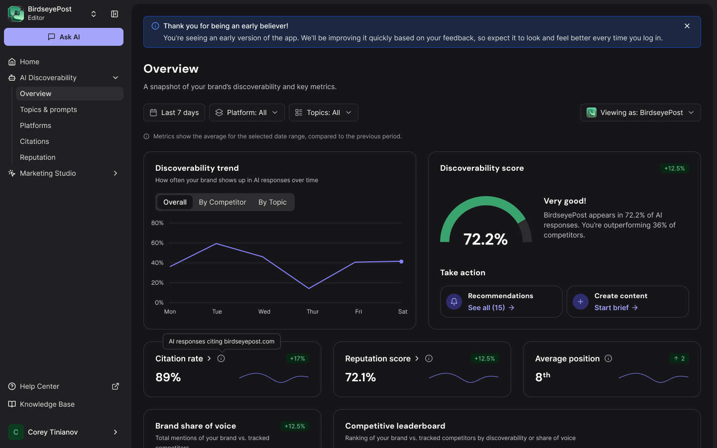 Writesonic is the complete GEO/AEO platform that tracks your brand's AI search visibility, identifies where competitors beat you, and executes the fixes—creating new content, refreshing existing pages, earning citations, and engaging on Reddit.