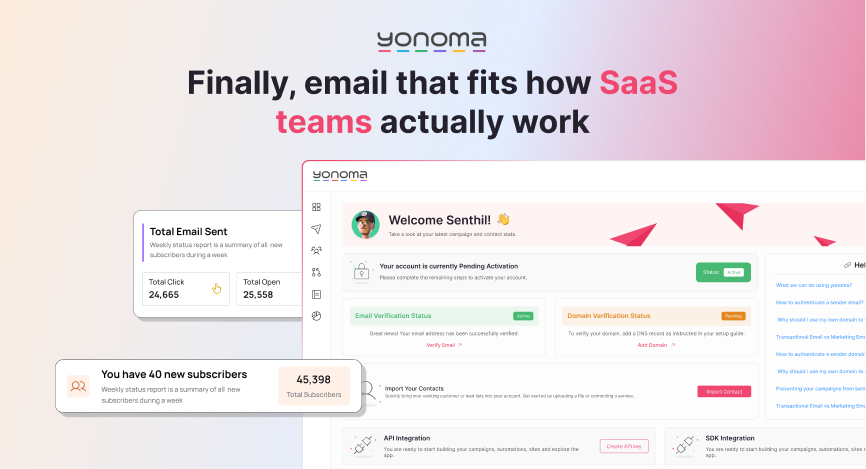 With Yonoma, saas teams can create lifecycle email campaigns, build automated workflows, segment users based on behavior, and track performance with real-time analytics — all in one clean and easy-to-use platform.