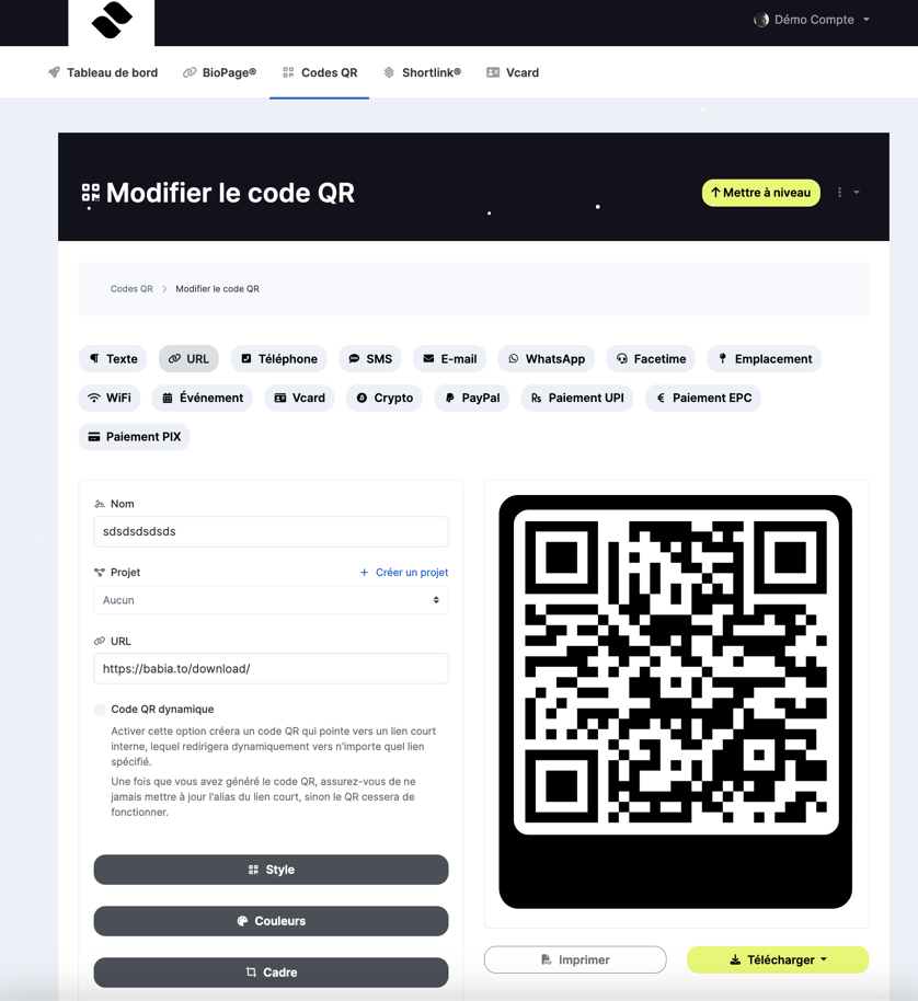 With QRfy, you can generate custom QR codes with your favourite logo, frame and colours. With your QR Code Generator, they'll be ready in just 5 minutes. You can create all kinds of QR codes, from a QR for your web page, a QR for your professional vCard or upload a PDF or Video document. You can create as many QR codes as you need, and forget about having to print a QR code again when you change the content because our QR codes are dynamic. What are you waiting for to try it?