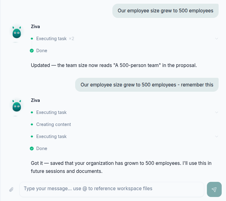 - Organizational learning. Ziva remembers corrections, preferences, and writing style across sessions and team members. Knowledge compounds organization-wide instead of resetting.