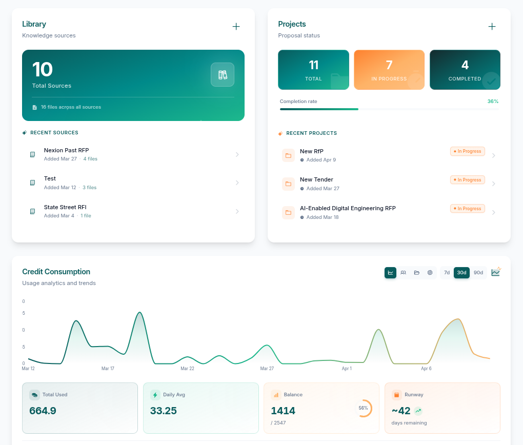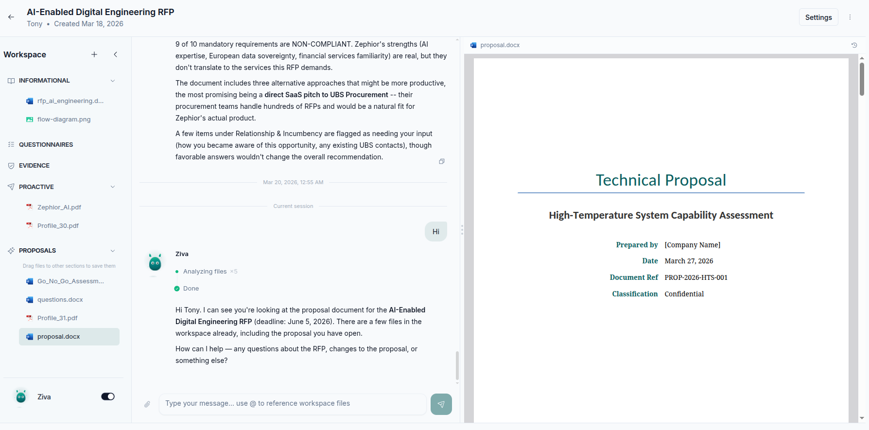 The platform has two modes that work from a single knowledge base. The questionnaire engine uses RAG to produce responses at 3-4 per minute, each with inline source citations and a trust score so reviewers know what to verify. The proposal engine runs Ziva inside a secure environment where she creates finished DOCX, PPTX, and PDF documents directly.