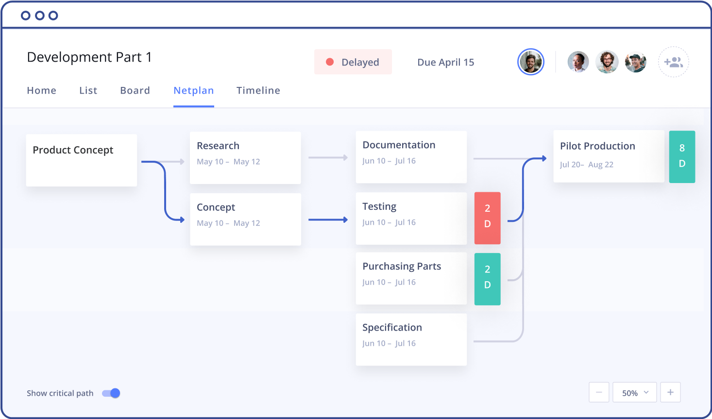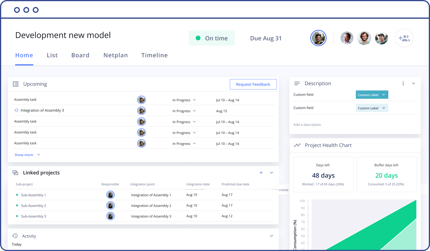 A plataforma oferece insights em tempo real e planejamento automatizado para alcançar objetivos mais rapidamente e com mais precisão. Uma plataforma multi-projetos que exibe todos os projetos em um só lugar com cronogramas detalhados e dependências. Ao alocar recursos e tempos de buffer de forma otimizada, os gargalos podem ser evitados, maximizando assim a produtividade.