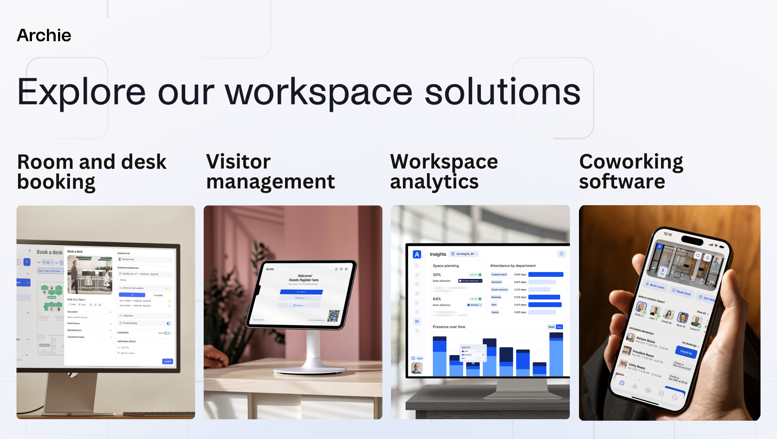 Archie alimenta milhares de escritórios modernos e espaços de trabalho compartilhados em todo o mundo, oferecendo uma solução integrada que inclui reserva de salas de reunião e mesas, gestão de visitantes, análises de espaço de trabalho e software de coworking.