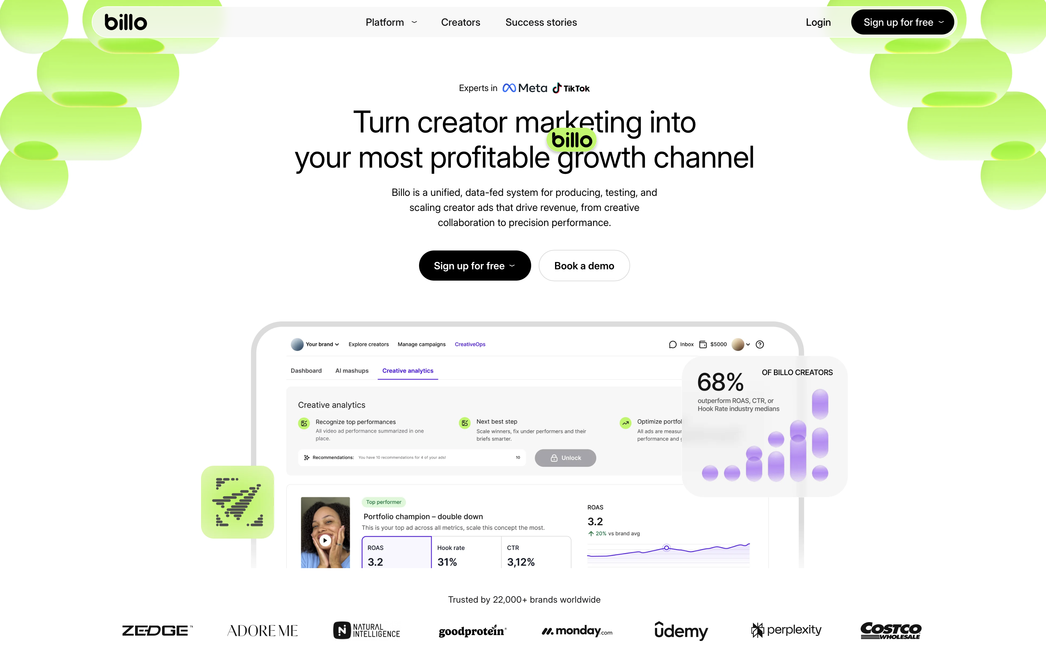 Billo é a primeira plataforma de marketing de criadores de seu tipo, que transforma parcerias entre marcas e criadores em um canal de crescimento mensurável. Ela traz colaboração criativa, testes e escala em um fluxo de trabalho alimentado por dados, para que as equipes passem da ideia ao anúncio vencedor sem adivinhações.