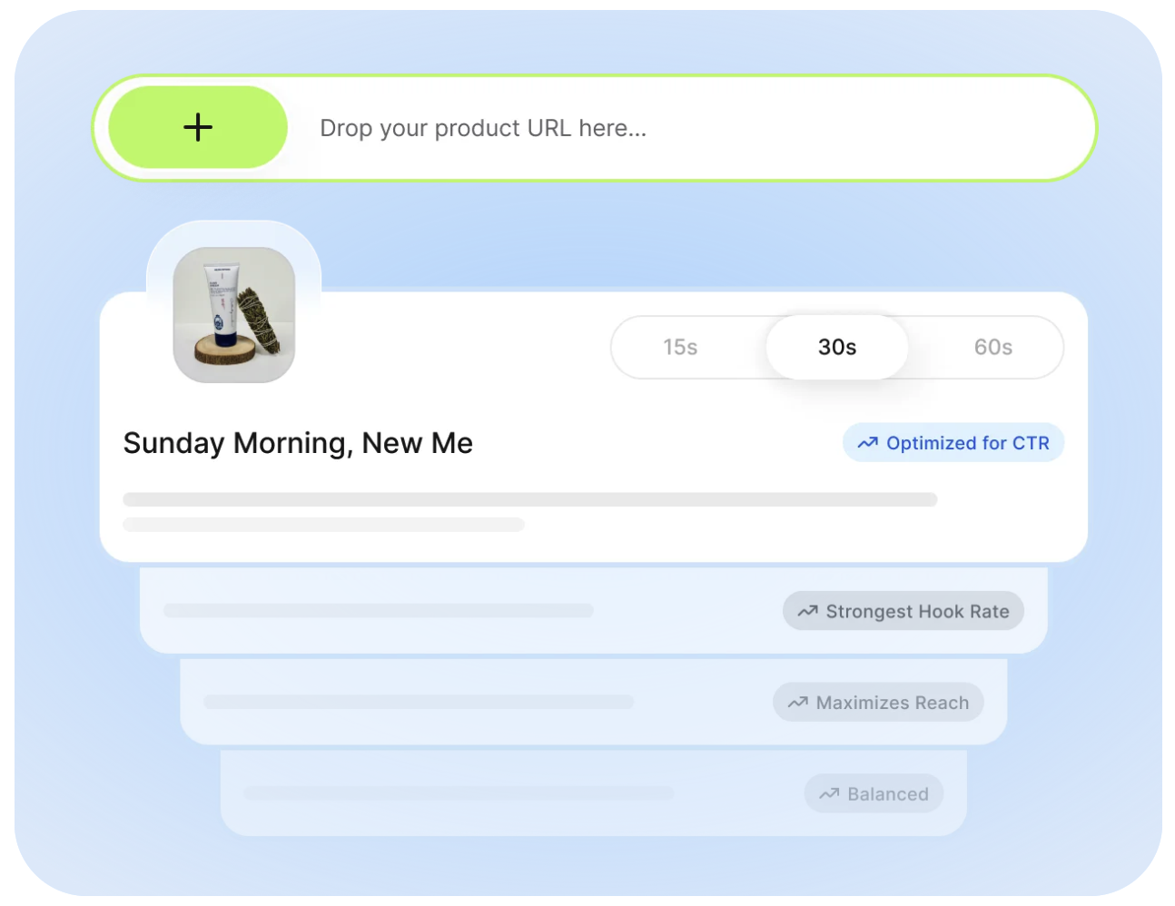 O sistema é construído com base em insights de mais de 326.000 anúncios em vídeo, com $505M em valor de compra gerado e $269M em gastos com anúncios. Esses sinais orientam os ângulos dos roteiros e a seleção de criadores em vídeos UGC, postagens de criadores e parcerias de anúncios no TikTok e Meta, para que você lance de forma mais inteligente e aprenda mais rápido.