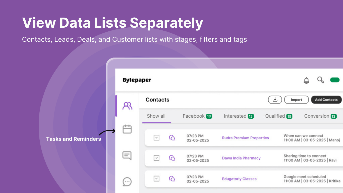 No seu núcleo, Bytepaper oferece um CRM de Vendas que ajuda as equipes a capturar leads em um só lugar, gerenciar leads, pipelines e relacionamentos com clientes em tempo real. Bytepaper ajuda as empresas a simplificar a qualificação e o cultivo de leads com gatilhos do WhatsApp.