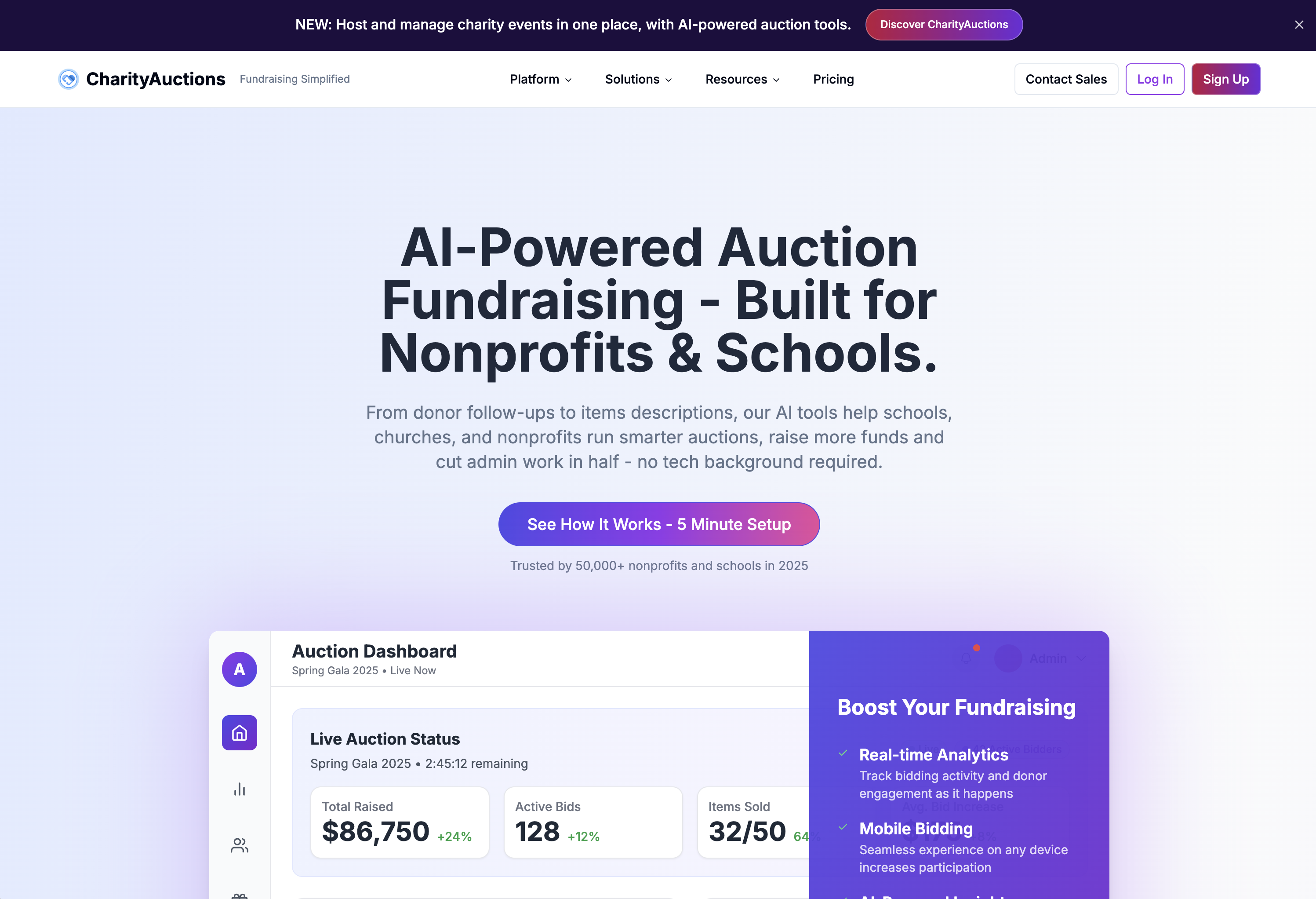 CharityAuctions capacita ONGs, escolas e organizações a arrecadar mais dinheiro com menos esforço através de um software de leilão impulsionado por IA. Nossa plataforma transparente e de baixo custo facilita a realização de leilões silenciosos, ao vivo ou online, enquanto automatiza pagamentos, envios e o engajamento de doadores.