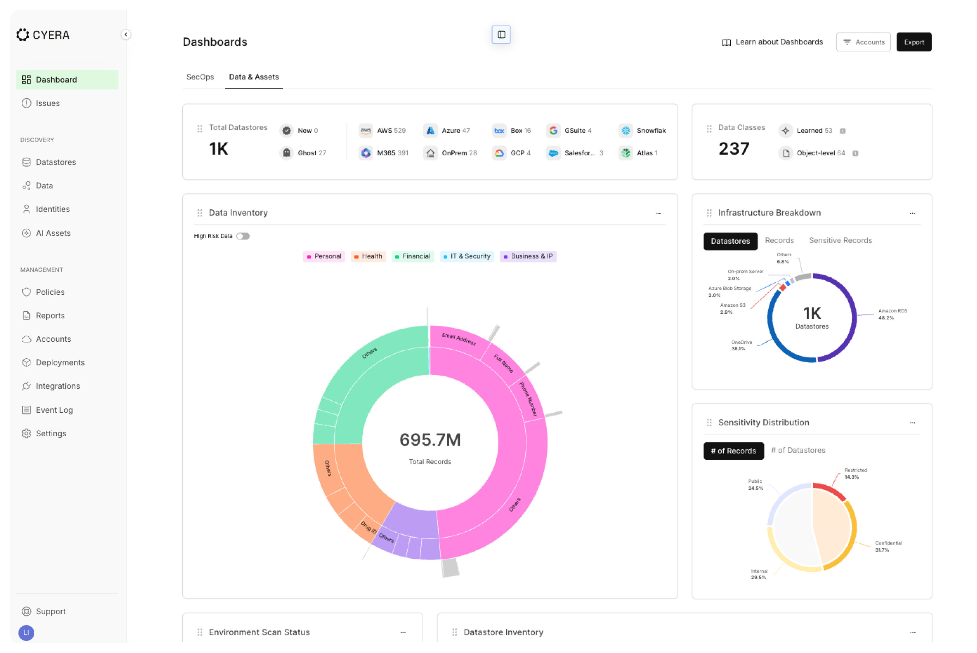 O que mais se destaca na Cyera é como ela lida com a varredura dentro dos repositórios de dados. Tendo usado várias ferramentas de Descoberta de Dados, achei que a descoberta local da Cyera através de Conectores foi particularmente suave e sem problemas. Em contraste, observei que outras ferramentas DSPM frequentemente fazem com que os servidores travem quando seus conectores ou agentes iniciam o processo de descoberta. Além disso, a Cyera se integra bem com plataformas de nuvem como Azure e GCP, tornando-a eficaz para descobrir dados nesses ambientes. Análise coletada por e hospedada no G2.com.