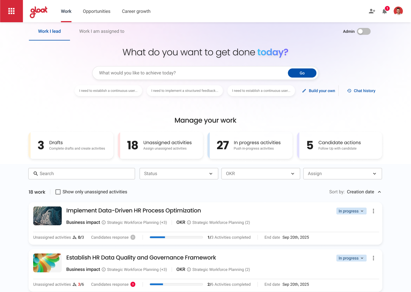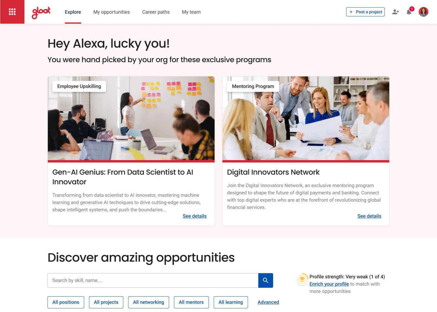 A grande vantagem do Gloat é a própria ferramenta. Realmente amigável para o usuário, funcional e é ótimo que a equipe do Gloat esteja continuamente atualizando e melhorando mensalmente, eles realmente estão ouvindo o feedback dos clientes. Mas eu diria que a melhor coisa é a equipe do Gloat - todos são realmente profissionais e prestativos - é um prazer colaborar com eles. Ainda estamos nos estágios iniciais da implementação, mas temos gostado de trabalhar com nosso PM - Crispin, equipe de gestão de mudanças, sucesso do cliente, equipe técnica, etc. Análise coletada por e hospedada no G2.com.