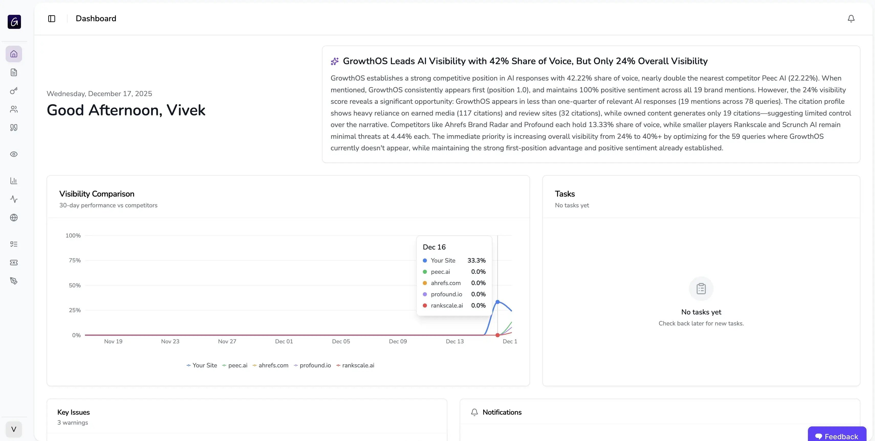Writesonic é a plataforma completa GEO/AEO que rastreia a visibilidade de busca de IA da sua marca, identifica onde os concorrentes superam você e executa as correções—criando novo conteúdo, atualizando páginas existentes, ganhando citações e interagindo no Reddit.