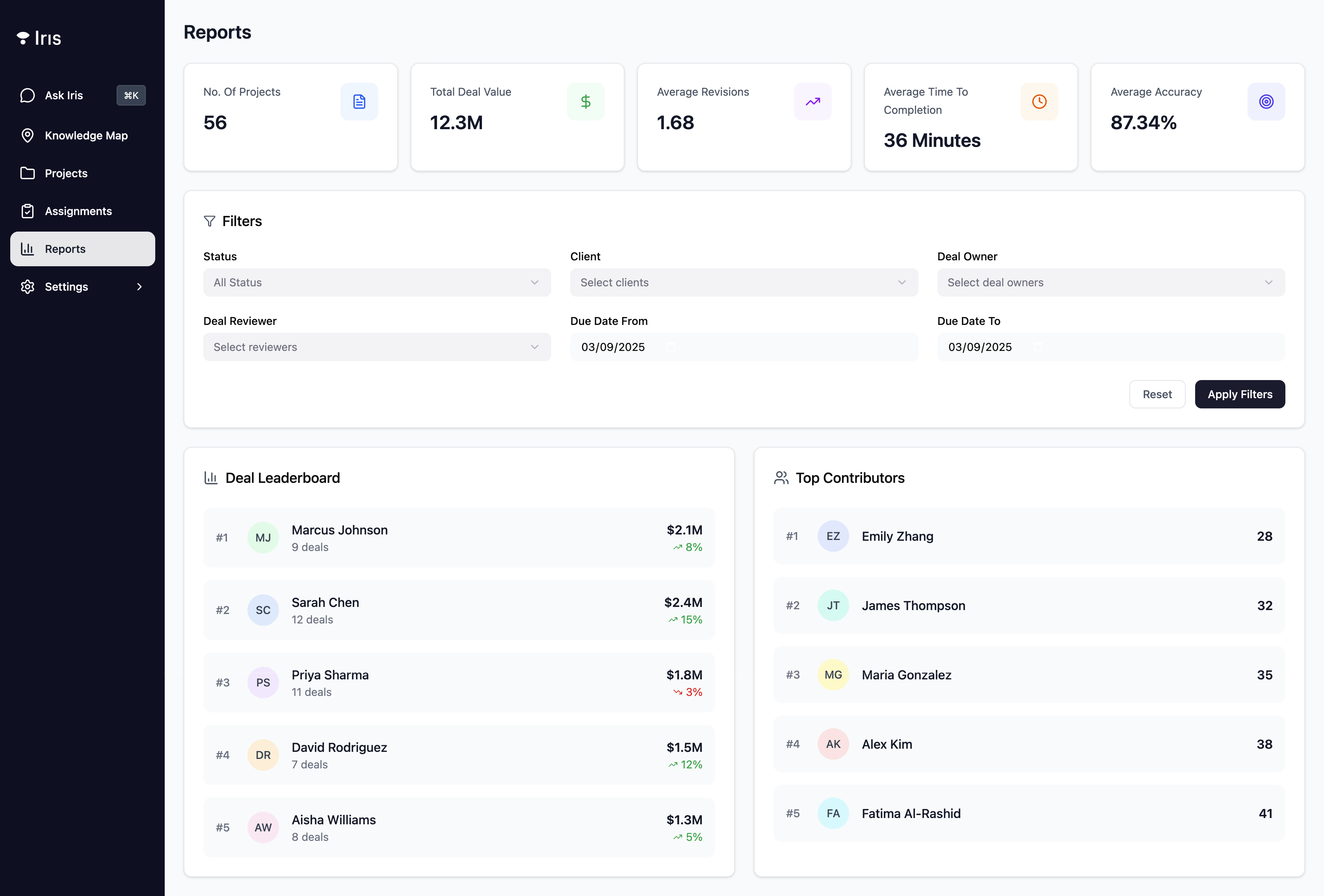 Iris é uma plataforma de deal desk nativa de IA que capacita equipes a automatizar respostas de alta qualidade para RFPs, questionários de segurança, DDQs, RFIs e outros documentos voltados para compradores. Projetada para equipes modernas de vendas, marketing e conformidade, a Iris simplifica cada etapa do processo de resposta—eliminando gargalos, reduzindo o trabalho manual e garantindo consistência em todas as entregas.