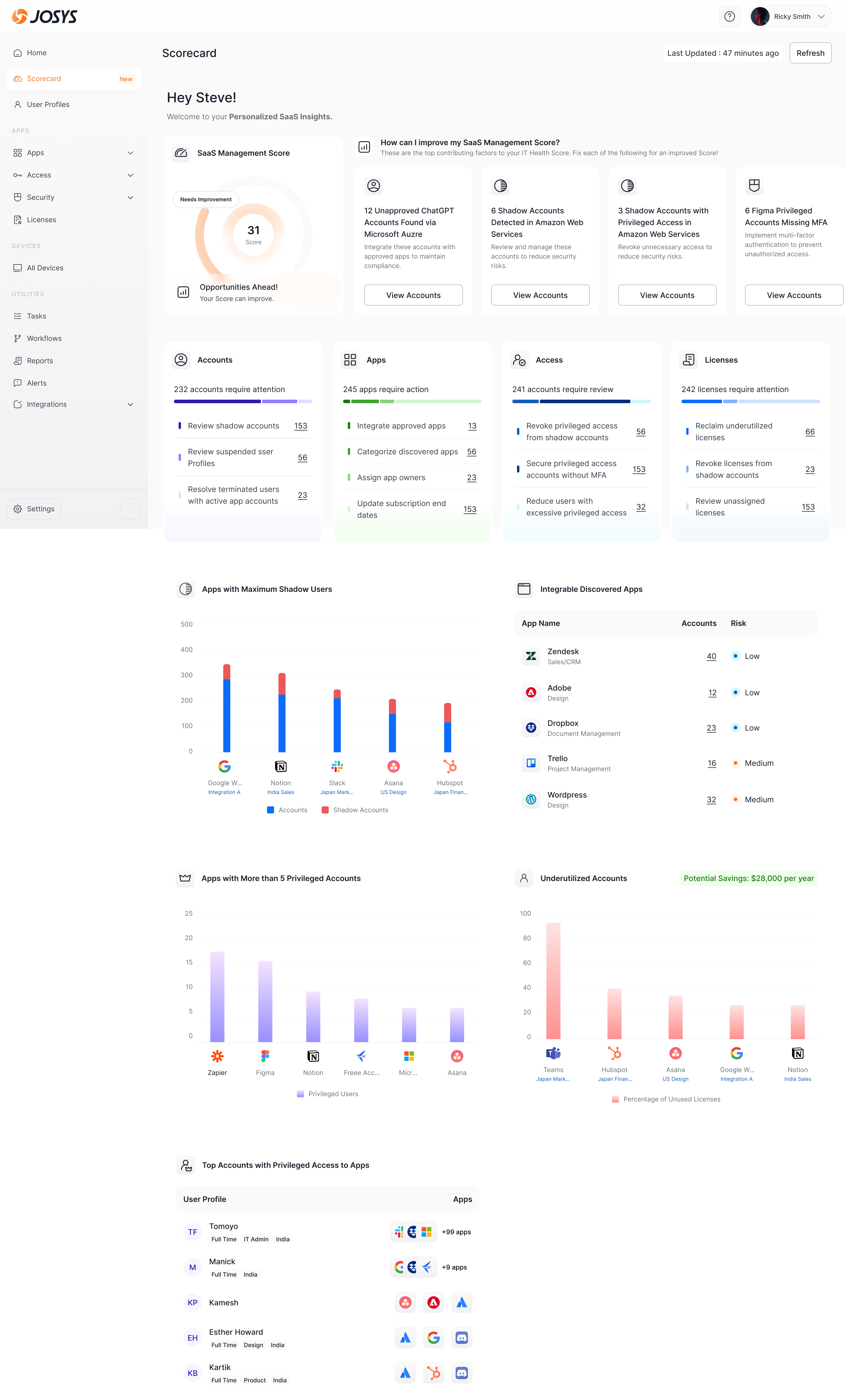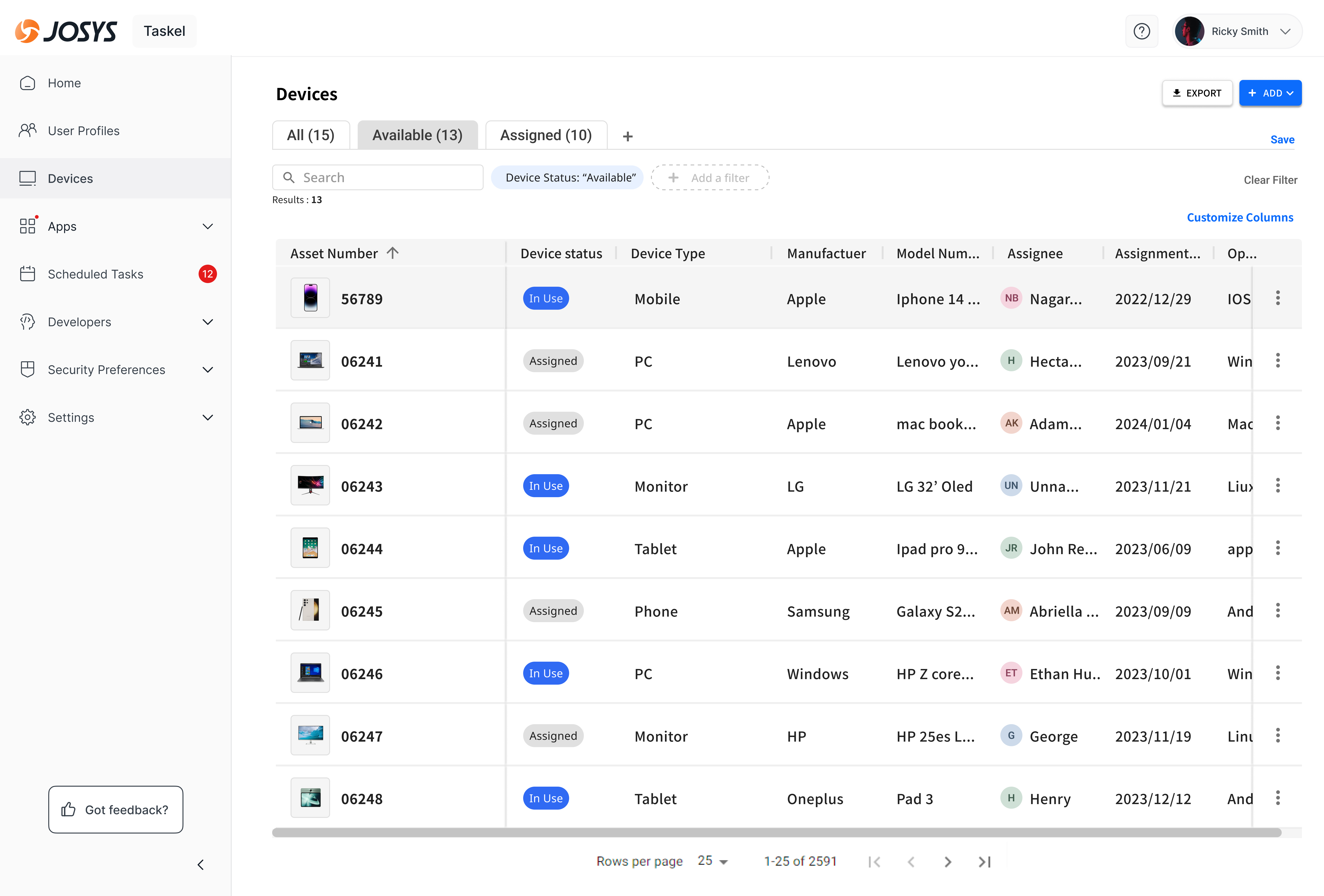 A introdução do Josys foi uma reforma muito importante para nós. Em primeiro lugar, a capacidade de gerenciar facilmente os ativos através do sistema é o ponto chave desta solução. Um dos principais benefícios é que, com apenas este único sistema, podemos gerenciar os dados principais dos nossos funcionários e verificar instantaneamente quem está usando o quê. Como os dados principais podem ser integrados com nossos sistemas existentes, não há necessidade de qualquer configuração especial ou etapas extras — e essa é outra grande vantagem ao começar. Análise coletada por e hospedada no G2.com.