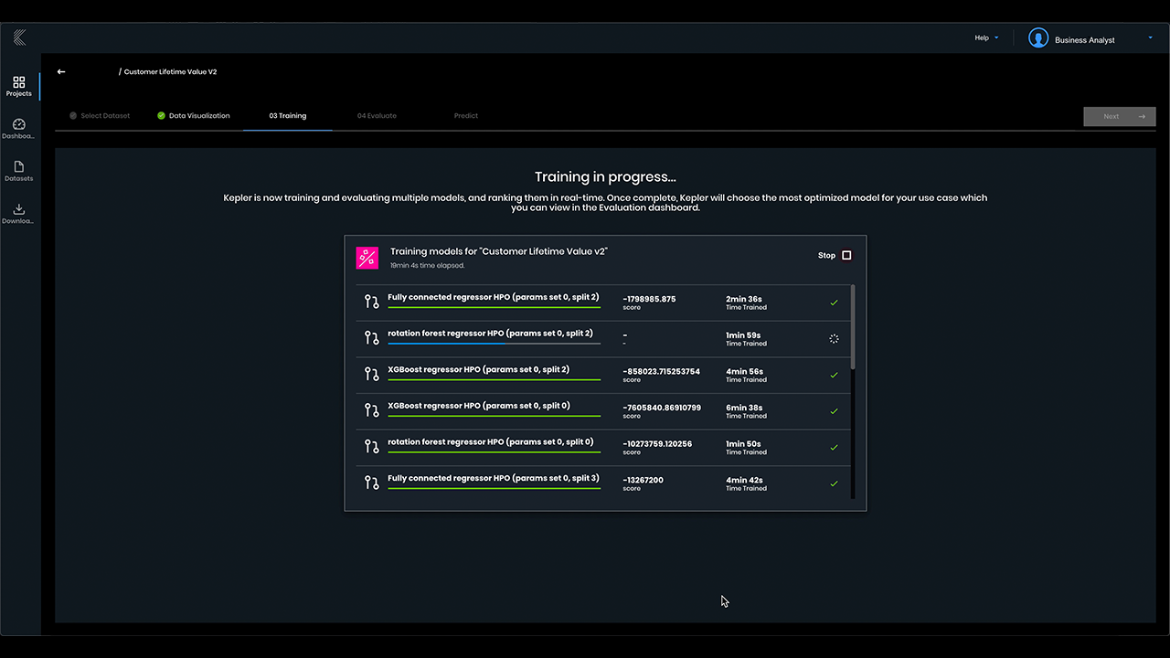 A plataforma Kepler permite que você leve projetos de IA e Aprendizado de Máquina (ML) ao mercado mais rapidamente com suas equipes e investimentos tecnológicos existentes. Ela faz isso combinando ML avançado — incluindo Aprendizado Profundo — com design intuitivo, tudo dentro de uma estrutura de autoatendimento construída para ajudar você a criar, treinar e implantar projetos de IA rapidamente. Isso ajuda a acelerar a adoção de IA automatizando o processo de ML de ponta a ponta, efetivamente capacitando usuários sem experiência em ML a aproveitar capacidades de ML de ponta para resolver centenas de casos de uso críticos para os negócios, incluindo: Previsão de Demanda, Previsão de Churn, Previsão de Valor Vitalício, Manutenção Preditiva, Análise de Sentimentos, Detecção de Anomalias, Otimização de Sessão/UX e Previsão de Intenção do Usuário.