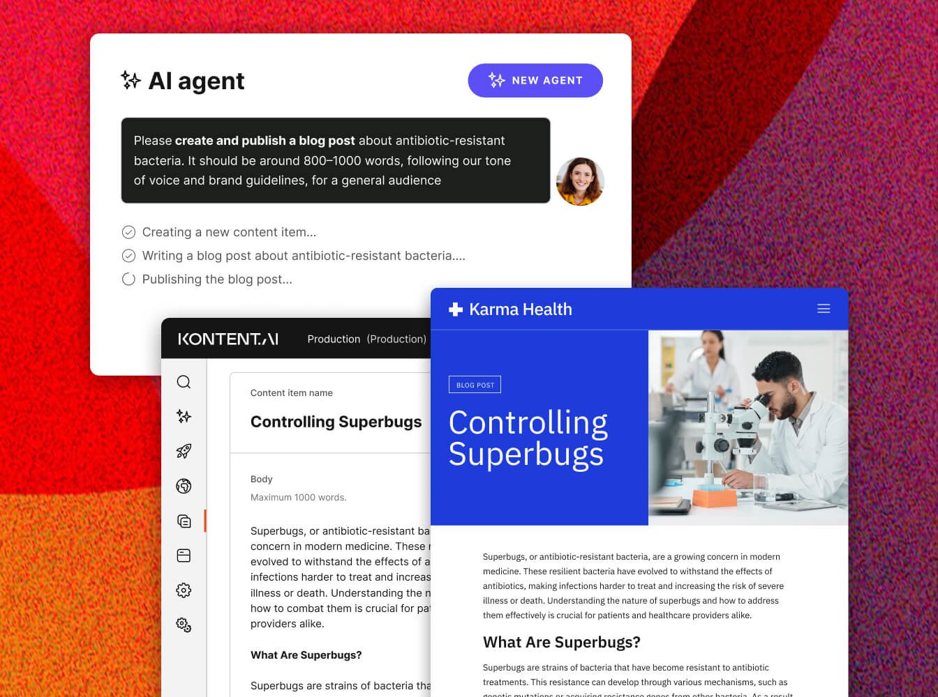 Kontent.ai é projetado para acomodar até os fluxos de trabalho de conteúdo mais complexos sem sacrificar velocidade, conformidade ou resultados. Agentes de IA ajudam a gerenciar conteúdo e fluxos de trabalho de forma proativa, simplificando tarefas manuais tediosas e permitindo que as equipes se concentrem em trabalhos mais estratégicos e criativos.