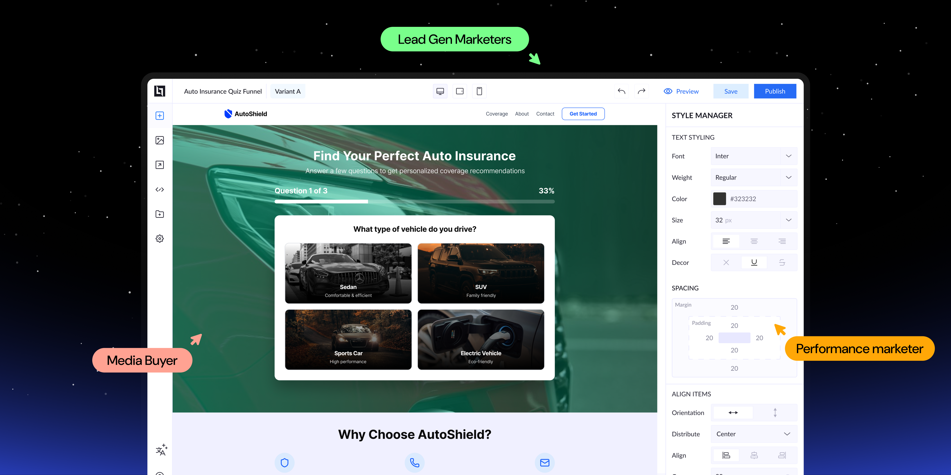 Uma função central do LanderLab é a criação de páginas de destino e otimização de campanhas. Os usuários podem construir páginas de destino do zero, usar modelos pré-desenhados ou gerar páginas com assistência de IA, dependendo das necessidades da campanha. Essas páginas podem incluir formulários de captura de leads, elementos de chamada para ação e outros componentes focados em conversão, projetados para incentivar os visitantes a fornecer informações ou completar uma ação. A plataforma também suporta funis de questionários em várias etapas que podem qualificar leads fazendo perguntas antes da submissão.