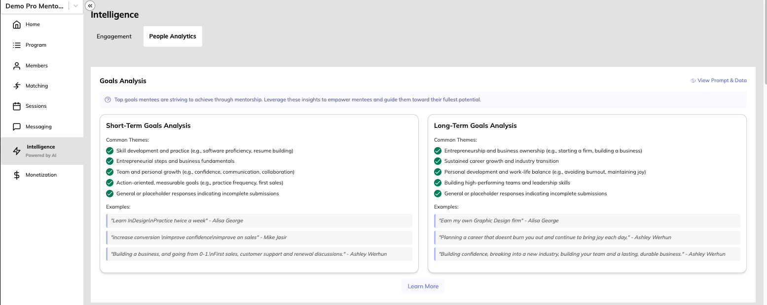 A análise de sentimento impulsionada por IA examina as conversas e feedbacks entre mentor e mentorado para avaliar a saúde do programa, a qualidade do relacionamento e a participação.