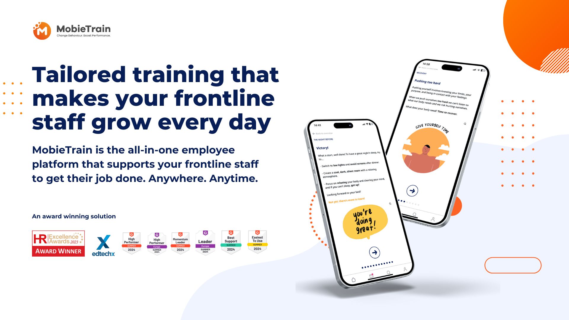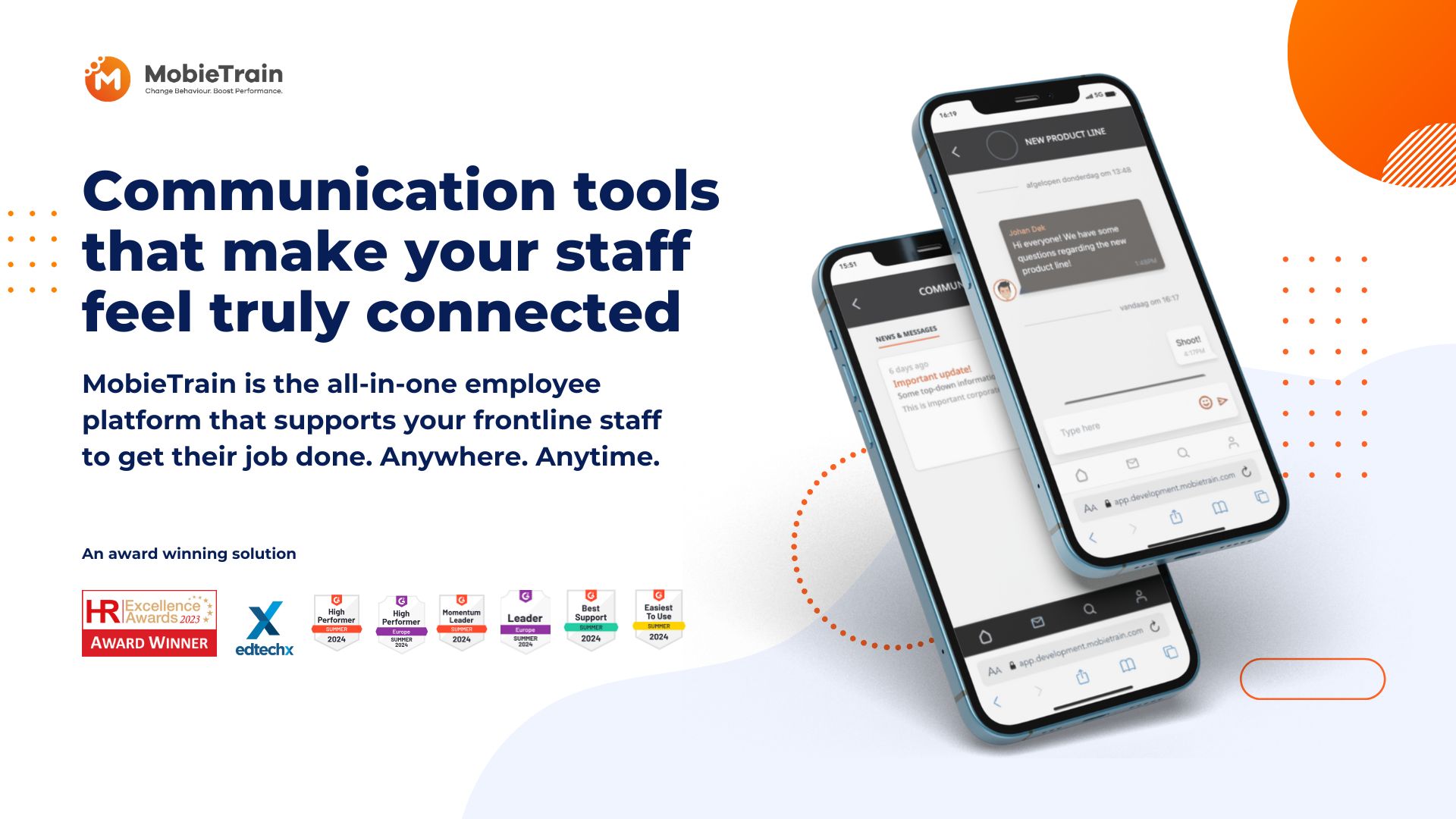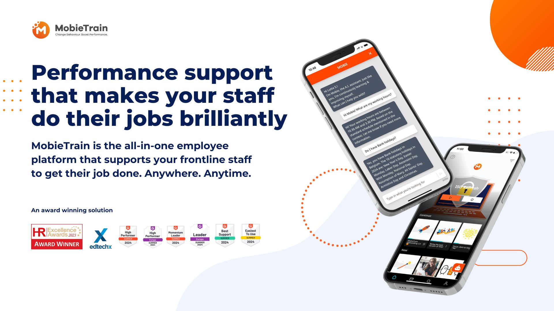 MobieTrain é uma plataforma completa para funcionários, projetada para apoiar a equipe de linha de frente na melhoria de seu desempenho no trabalho. Esta solução inovadora atende às necessidades únicas de organizações com uma força de trabalho móvel, permitindo que os funcionários aprendam, se comuniquem e executem suas tarefas de forma eficiente, independentemente de sua localização ou restrições de tempo.