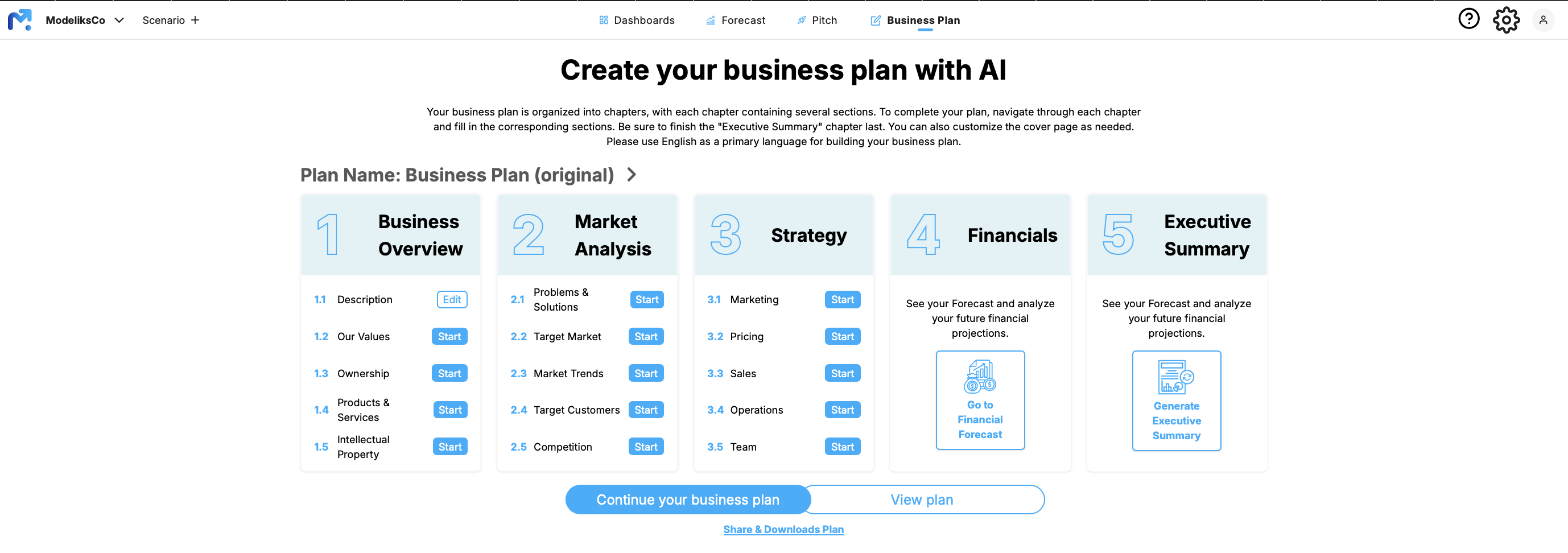 Modeliks é um software de planejamento empresarial que ajuda startups e PMEs a criar apresentações, planos de negócios ou financeiros e relatórios para investidores. Software de planejamento empresarial guiado, onde não é necessária experiência prévia.