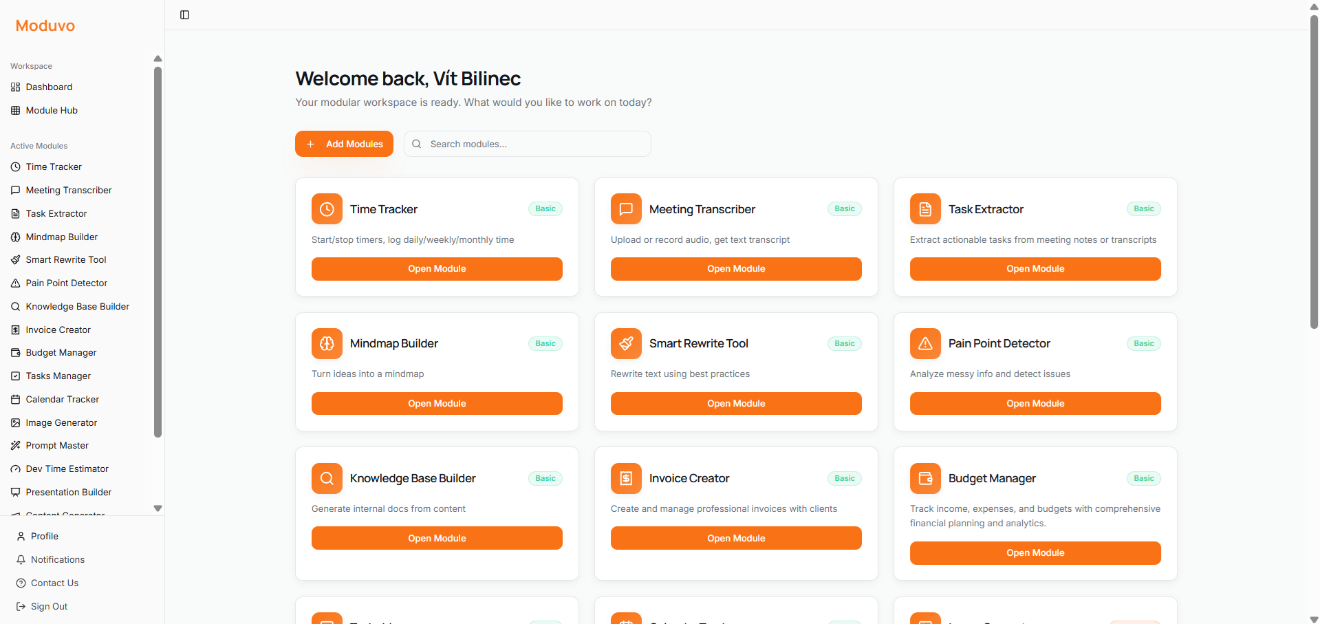 Moduvo é uma plataforma de assistente modular projetada para aumentar sua produtividade em vários aspectos do trabalho diário. Seu principal objetivo é ajudá-lo a gerenciar tudo, desde tarefas de suporte até vendas, gestão e mais, permitindo que você combine e ajuste uma suíte de módulos de produtividade—tudo em um só lugar. Aqui está uma análise detalhada do que o Moduvo faz e como ele pode ajudá-lo: