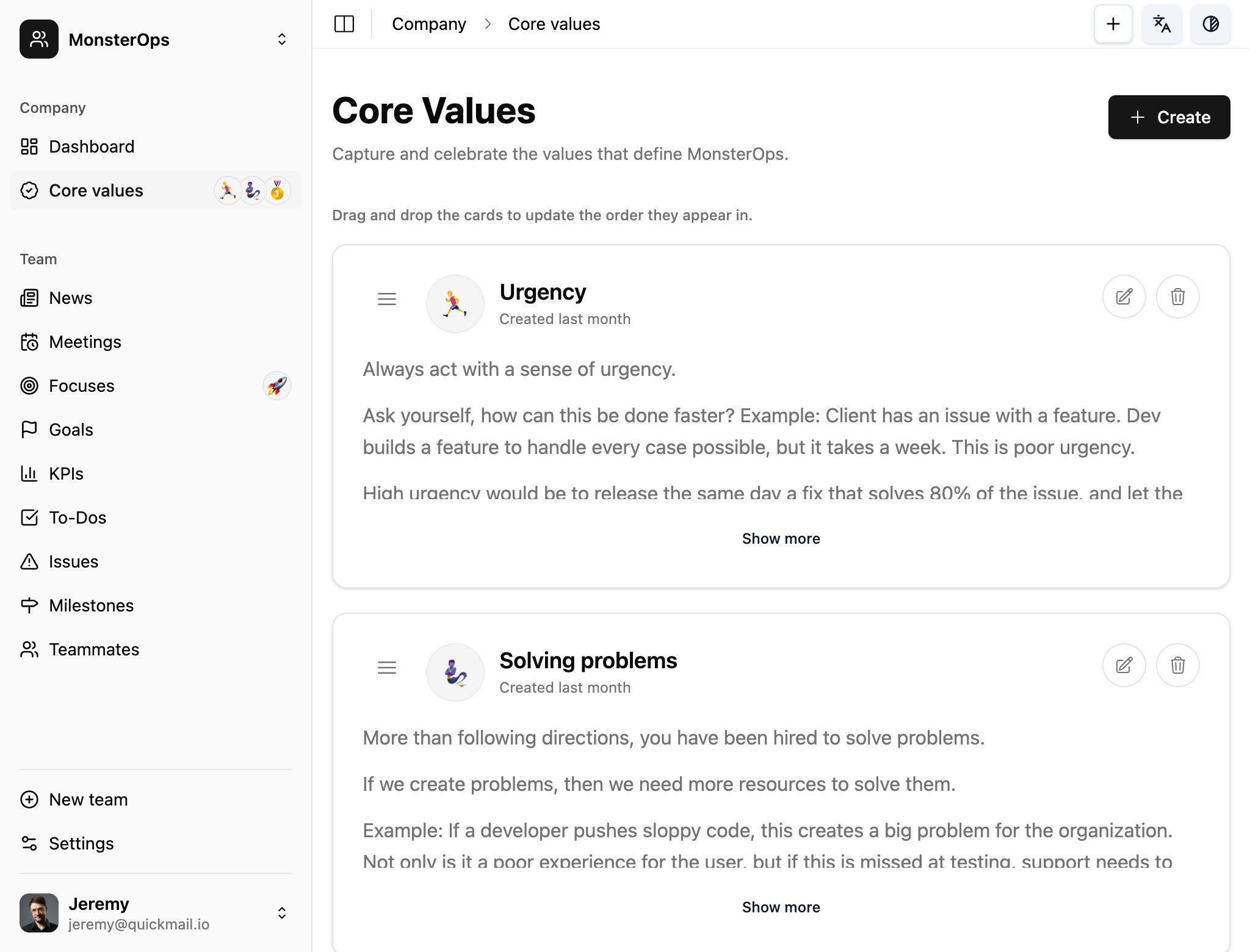 MonsterOps é uma plataforma de Sistema Operacional de Negócios (BOS) criada para PMEs e empresas em crescimento que desejam estrutura sem o inchaço corporativo. Ela ajuda fundadores e equipes de liderança a operarem no EOS para auto-implementadores ou qualquer BOS, usando um hub simples em vez de planilhas, documentos e ferramentas dispersas.
