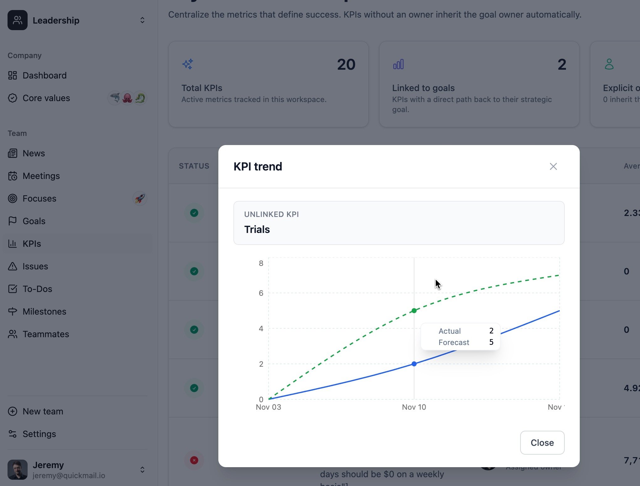 • Revisar métricas/KPIs, rochas/metas, problemas e tarefas em uma tela, com análises
