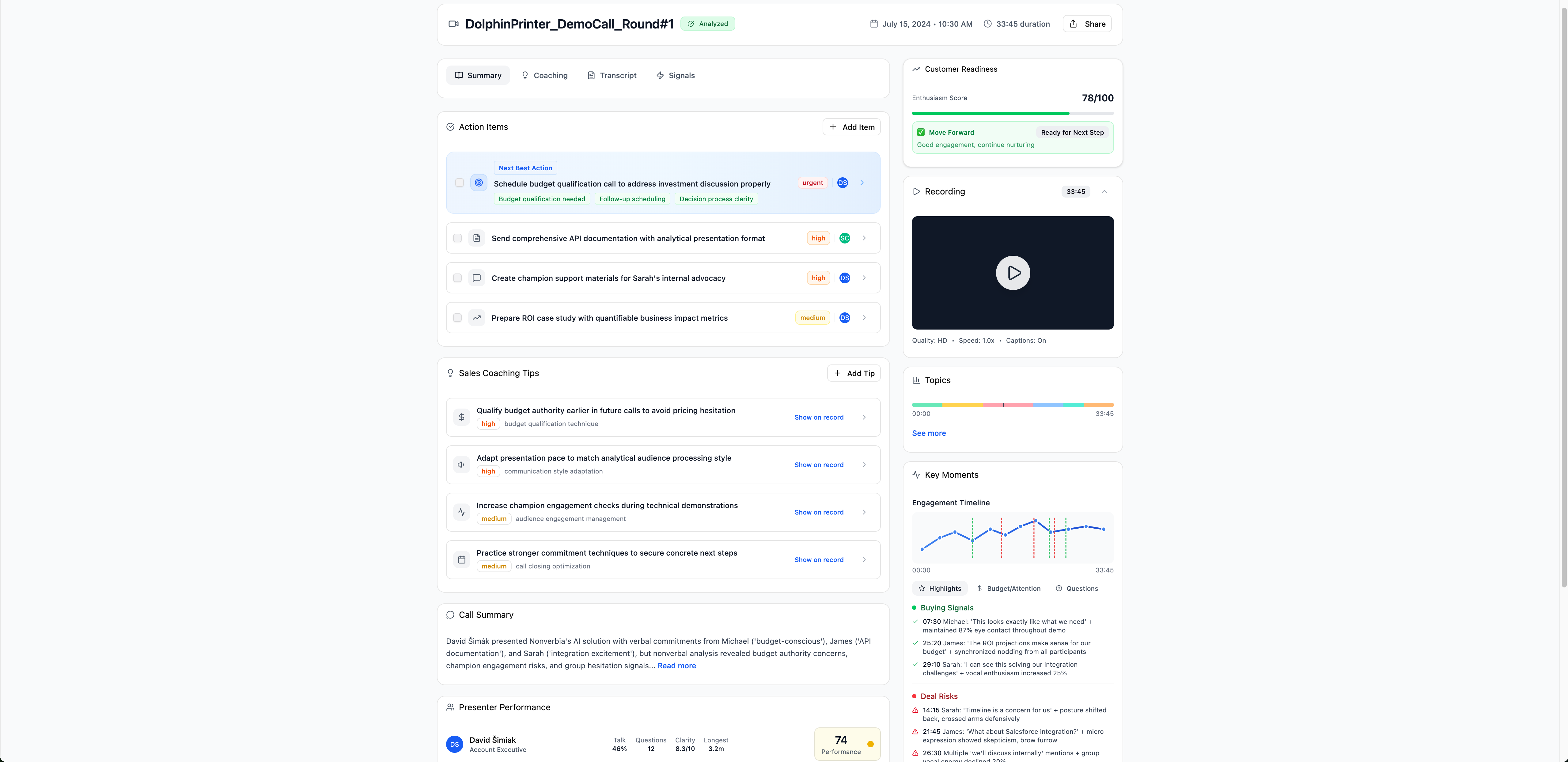 Um assistente de reuniões com tecnologia de IA para equipes de Vendas e Sucesso do Cliente capturar, transcrever, resumir, analisar e colaborar em todas as conversas com clientes — em escala. Aumenta a produtividade da equipe, aumenta o coaching entre pares e o compartilhamento de conhecimento, e, em última análise, fecha mais negócios e encanta os clientes.