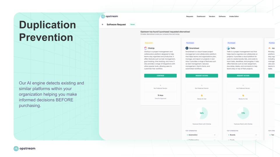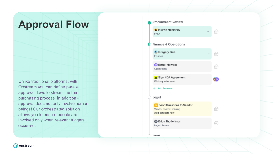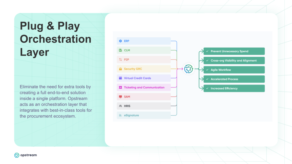 A capacidade do Opstream de se integrar com centenas de ferramentas de negócios cria um sistema unificado para gerenciar operações de compras, o que é essencial para organizações que visam reduzir a complexidade. A plataforma demonstrou melhorias significativas na eficiência, com uma redução relatada de 47% no tempo de manuseio de solicitações e uma diminuição de 90% no tempo de implementação. Além disso, organizações que utilizam o Opstream experimentaram uma redução de 23% nas despesas, contribuindo para economias de custo substanciais. Ao alcançar 100% de conformidade e minimizar compras paralelas, o Opstream permite que as empresas se concentrem em iniciativas estratégicas em vez de serem sobrecarregadas por tarefas administrativas.