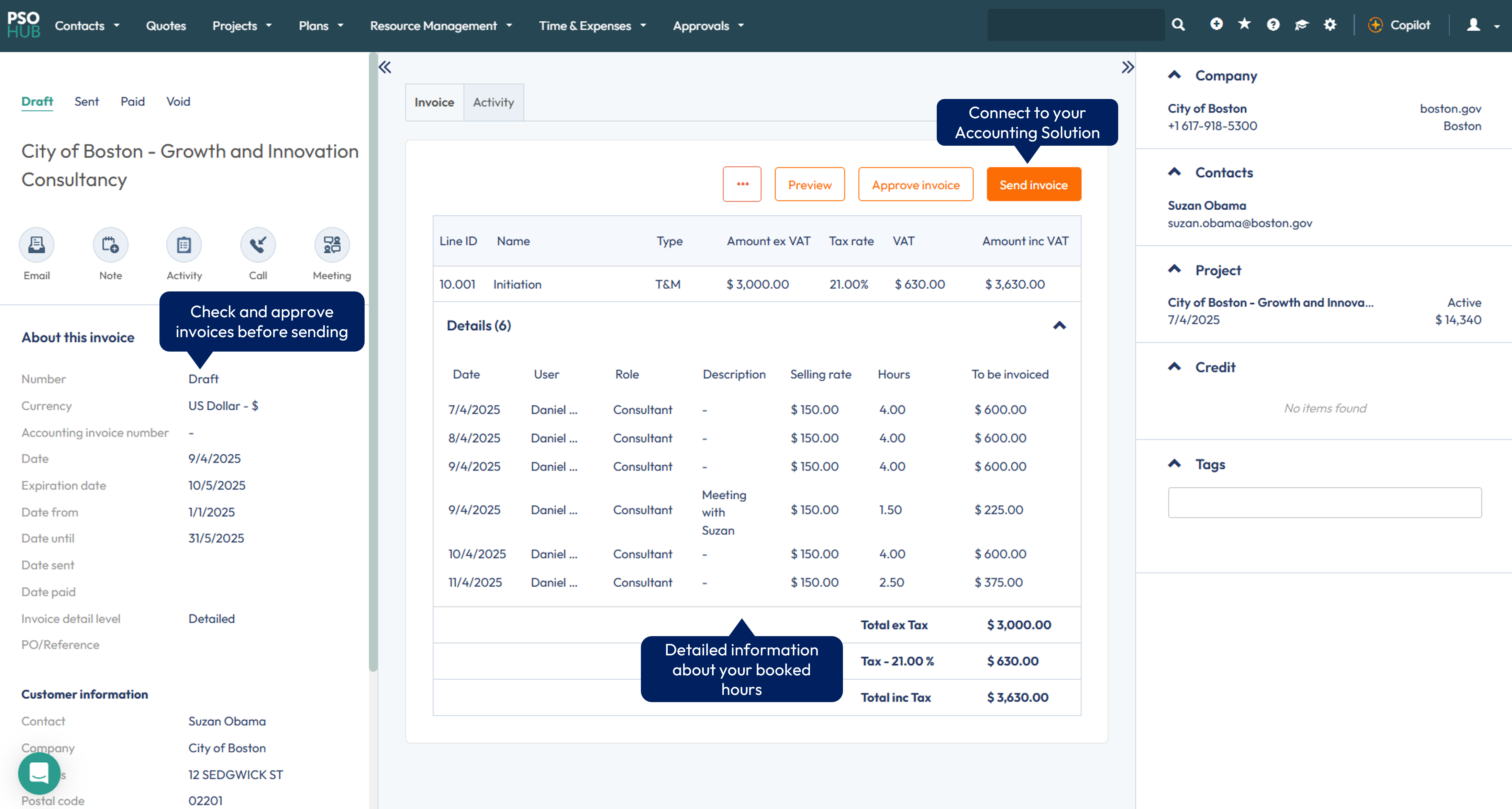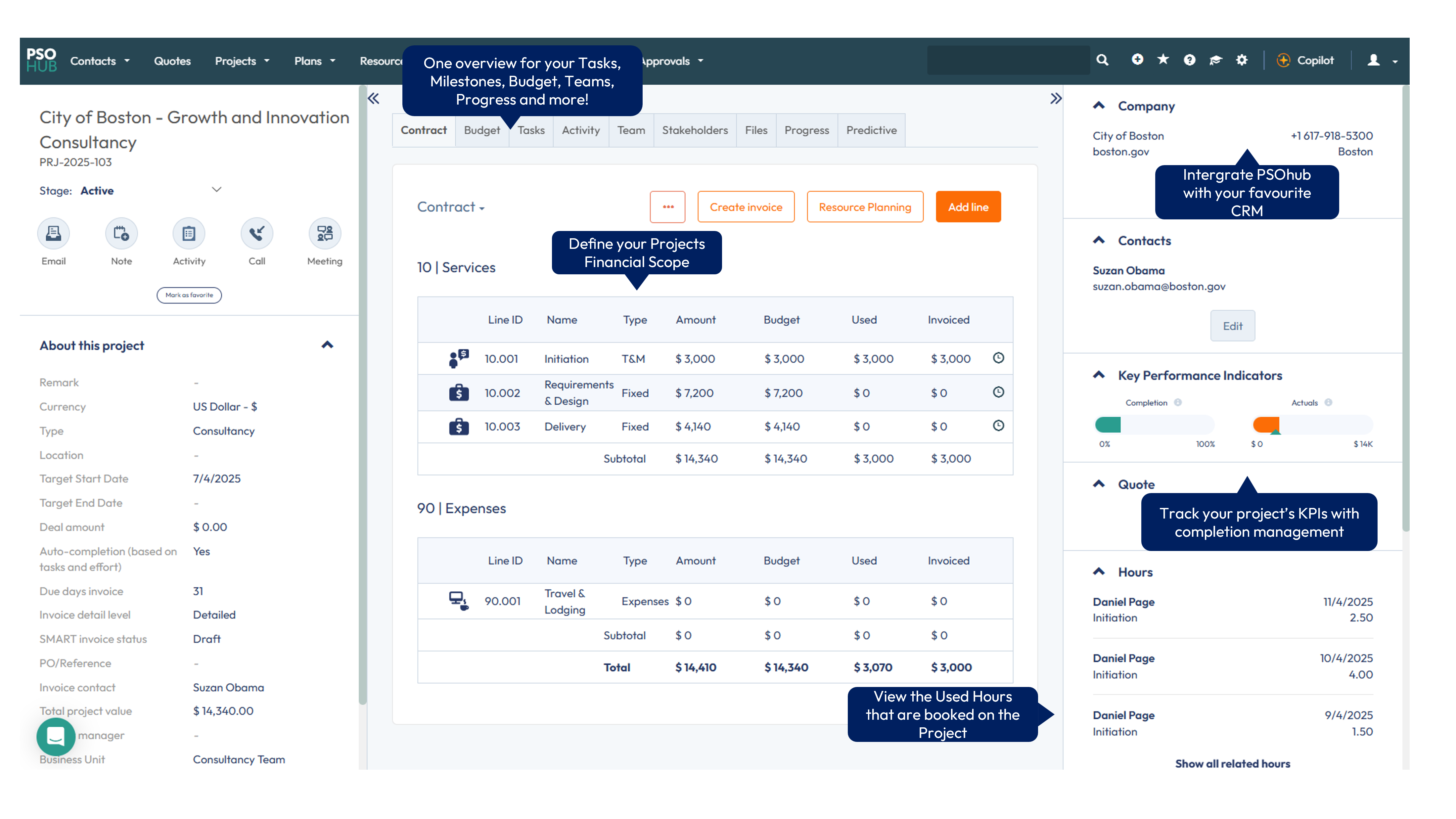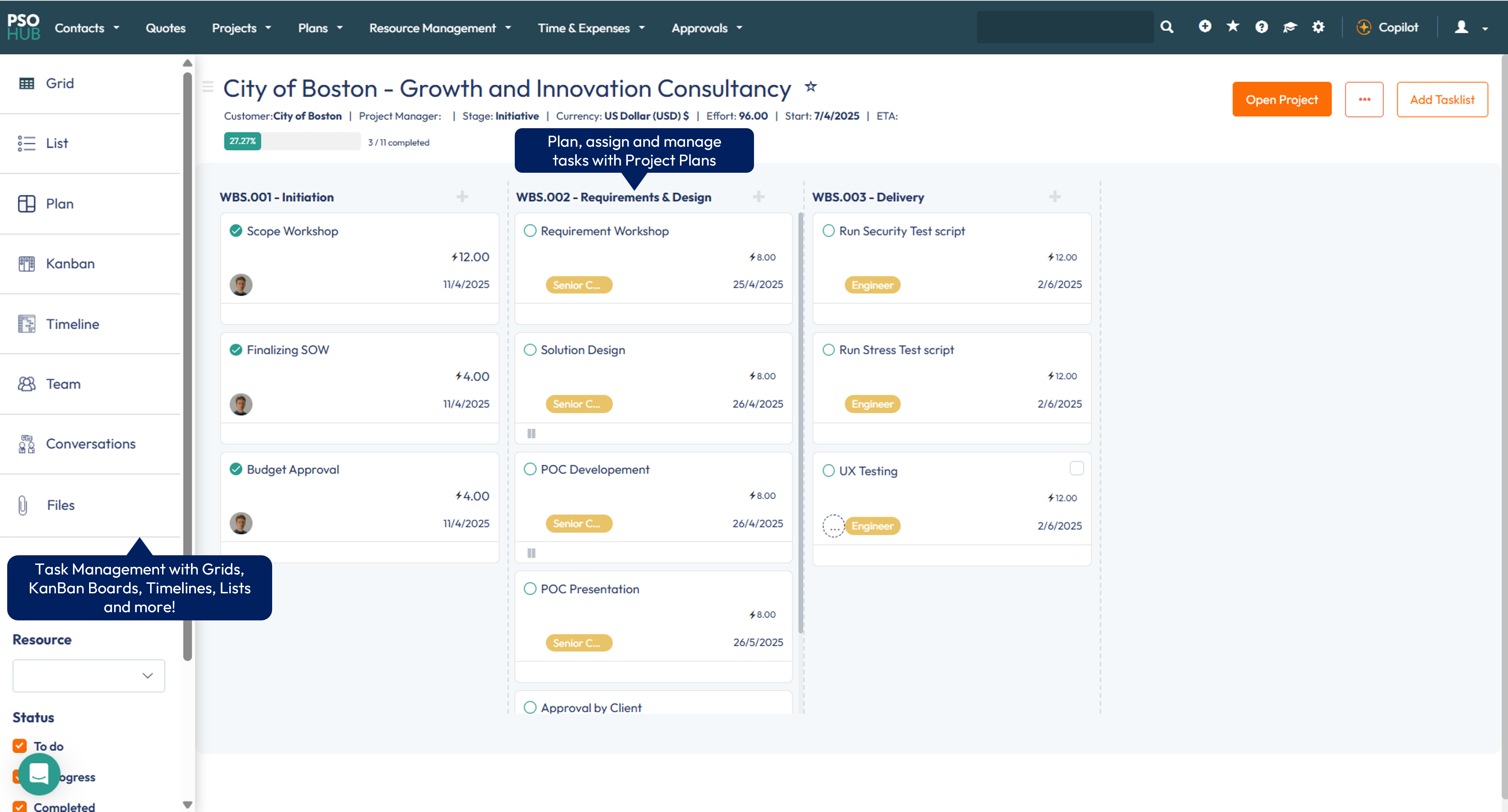 O PSOhub aborda os desafios comuns enfrentados por organizações de serviços profissionais, como gerenciar múltiplos projetos, rastrear tempo e despesas com precisão e garantir faturamento pontual. Ao consolidar essas funções em uma única plataforma, o PSOhub melhora a colaboração, reduz a sobrecarga administrativa e fornece insights em tempo real sobre o desempenho do projeto. Essa abordagem abrangente permite que as empresas melhorem a eficiência, aumentem a lucratividade e entreguem projetos excepcionais aos seus clientes.