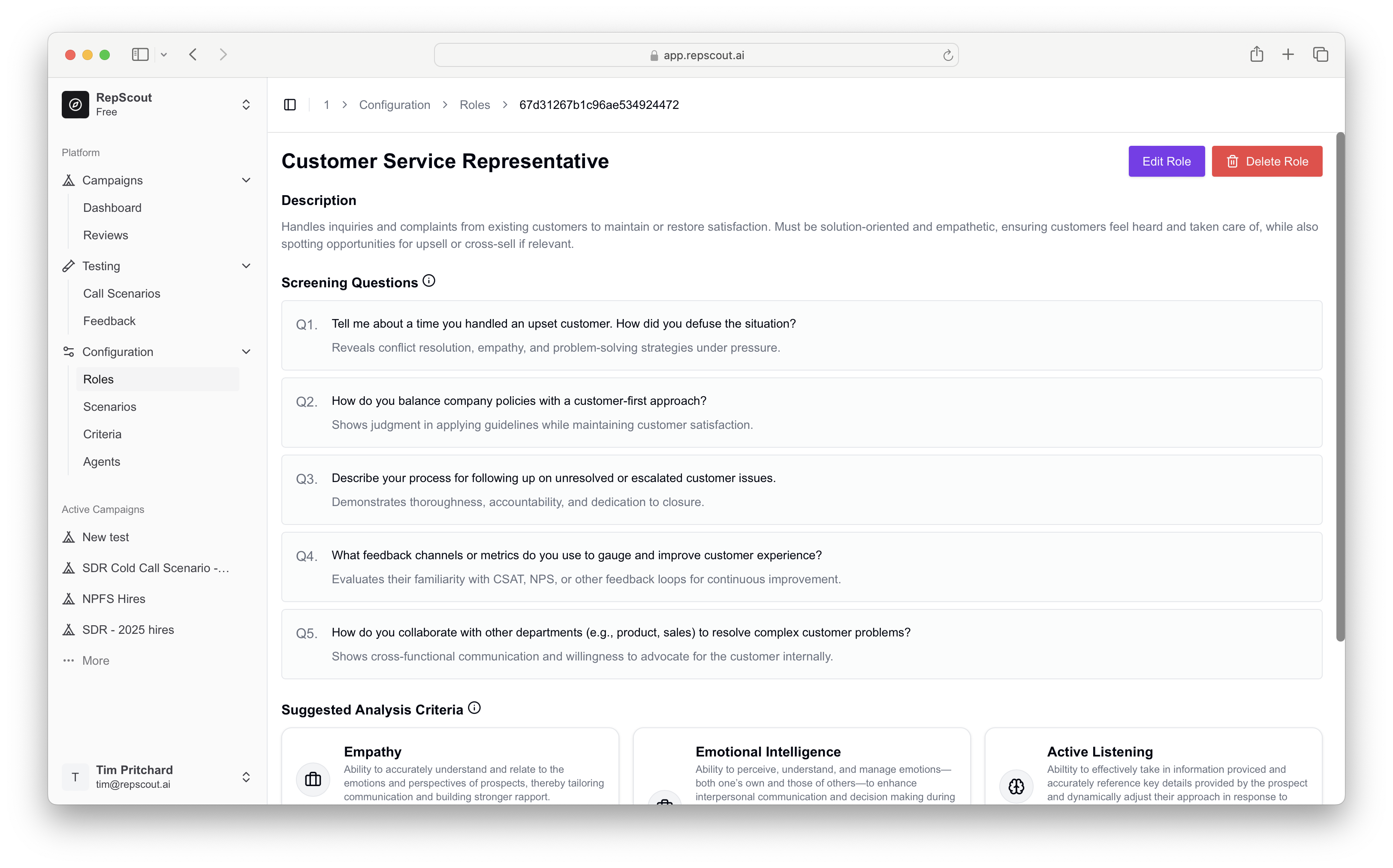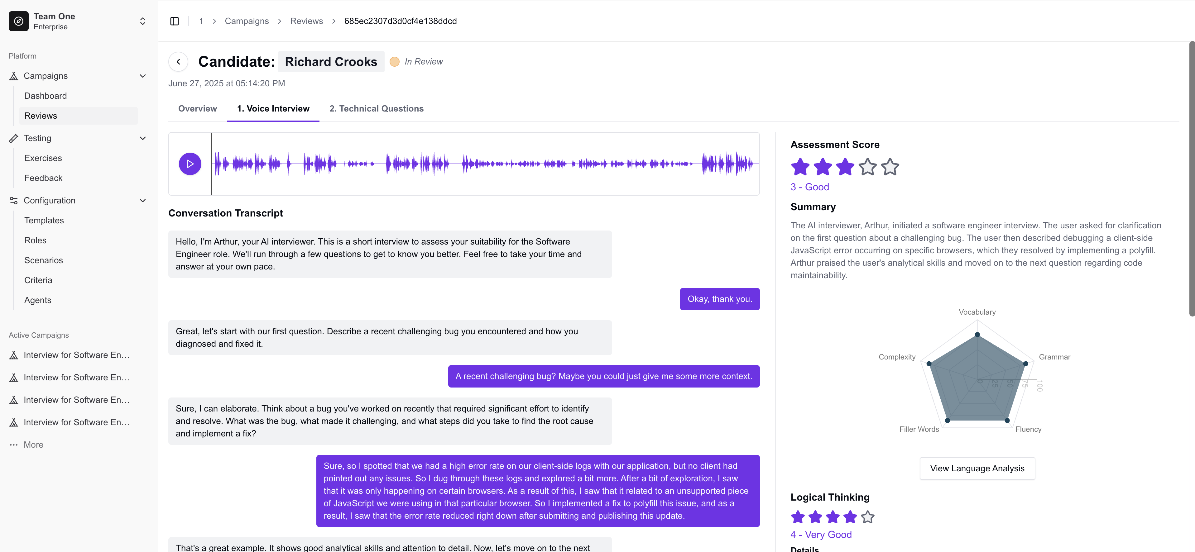 Todos os candidatos recebem um link para uma entrevista baseada em comportamento. Eles têm uma conversa automática em texto. Nossa tecnologia de triagem por IA revisa as respostas, priorizando os melhores candidatos para você considerar primeiro.