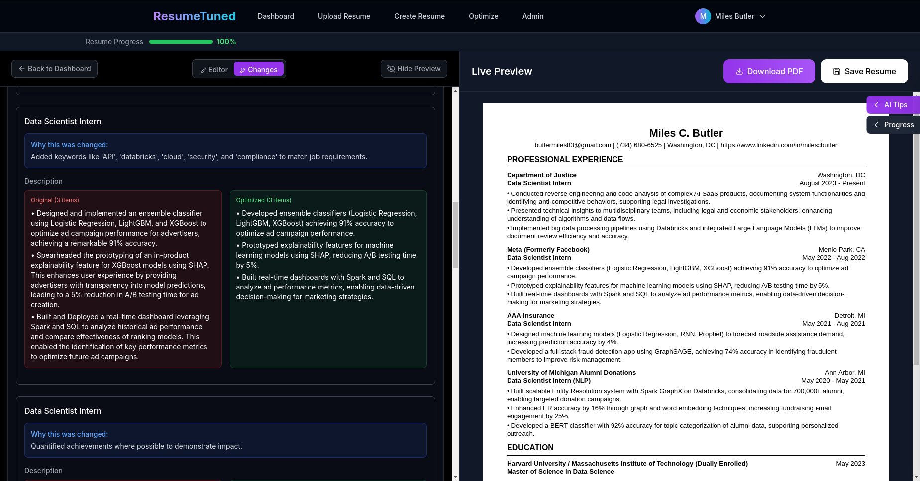 O Otimizador de Currículos da ResumeTuned é uma solução de ponta projetada para ajudar candidatos a emprego a transformar seus currículos em documentos direcionados e profissionais que ressoam com recrutadores e sistemas de rastreamento de candidatos (ATS). Aproveitando a tecnologia avançada de IA e dados do mercado de trabalho em tempo real, o Otimizador de Currículos garante que seu currículo esteja alinhado com os padrões da indústria e descrições de trabalho específicas, aumentando drasticamente suas chances de conseguir entrevistas.