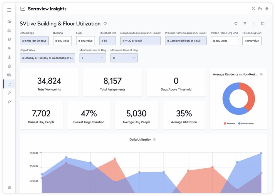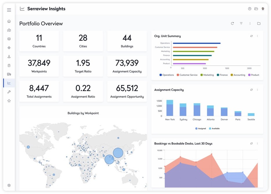 O Serraview permite que os usuários visualizem plantas de piso, acompanhem tendências de ocupação em tempo real e gerem relatórios que informam decisões estratégicas sobre alocação de espaço. O software integra-se com tecnologia de sensores e outros sistemas prediais para fornecer dados precisos sobre o uso de mesas e a disponibilidade de salas de reunião. Os usuários podem modelar diferentes cenários para mudanças ou reconfigurações de escritório usando ferramentas de planejamento de arrastar e soltar. O Serraview também apoia o engajamento dos funcionários oferecendo recursos de orientação que ajudam a equipe a localizar colegas ou espaços de trabalho disponíveis.