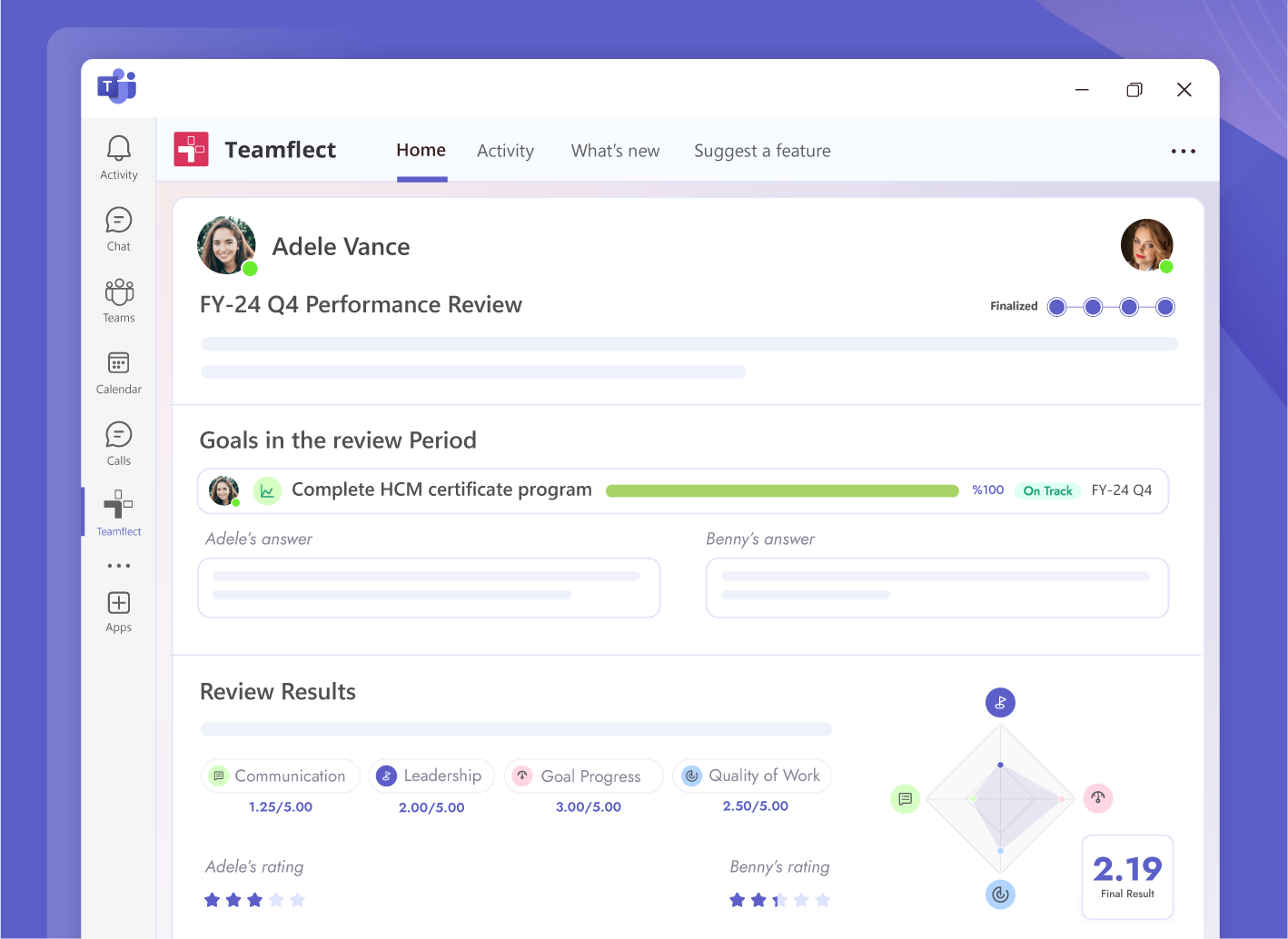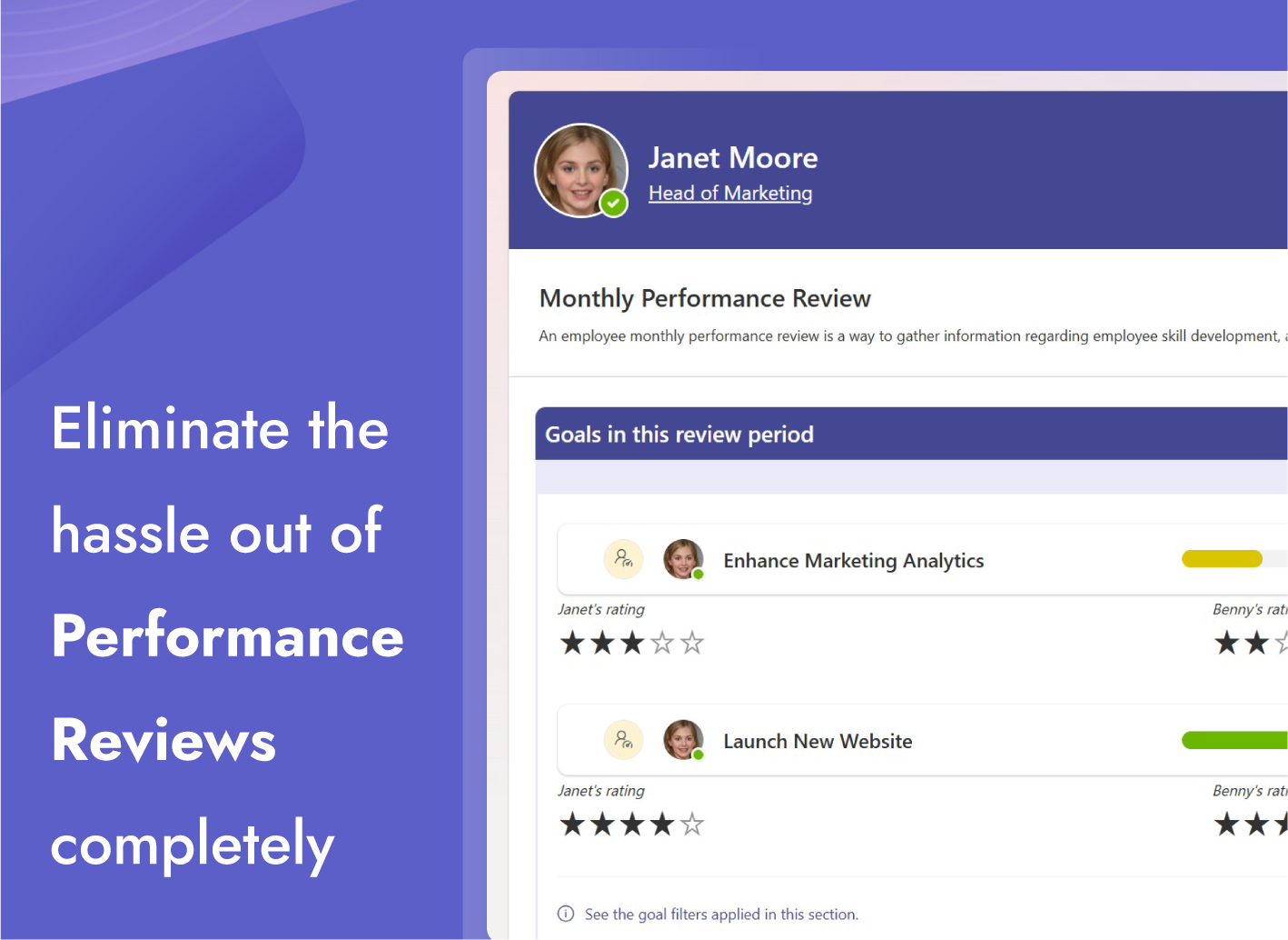 Aprecio a capacidade de incorporar links, permitindo que os membros da equipe acessem diretamente documentos que apoiam nossos objetivos. O recurso de realizar revisões por pares é valioso, e gosto de como ele facilita o engajamento da equipe ao permitir feedback sobre o desempenho. Também gosto de como ele se integra com o Microsoft Teams, fornecendo um local centralizado para todo o nosso trabalho. Análise coletada por e hospedada no G2.com.