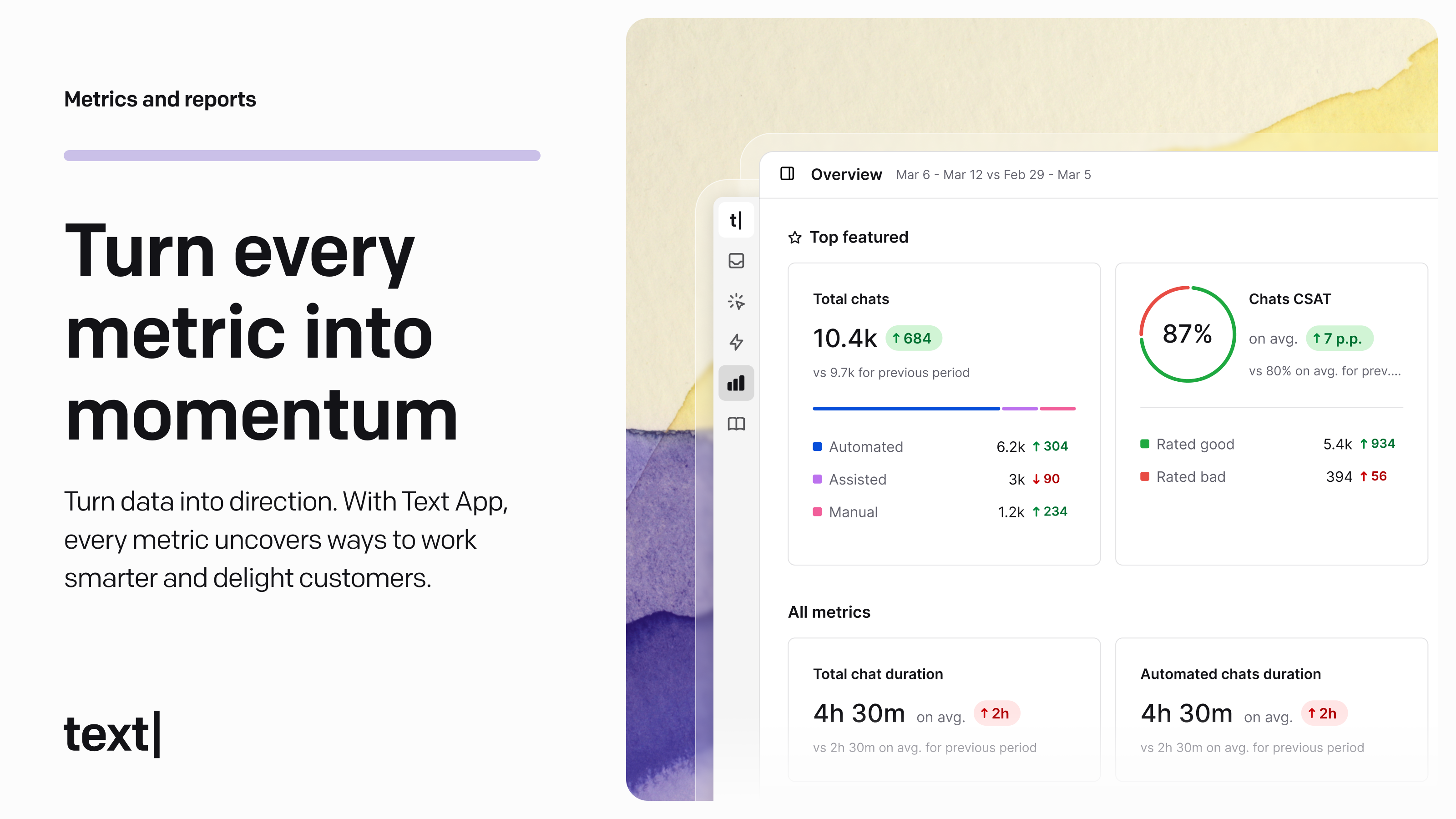 O Text App também inclui painéis de desempenho para monitorar a precisão da IA, a atividade dos agentes e a satisfação do cliente, ajudando as equipes a reduzir o trabalho repetitivo, resolver problemas mais rapidamente e manter um serviço consistente em todos os canais.