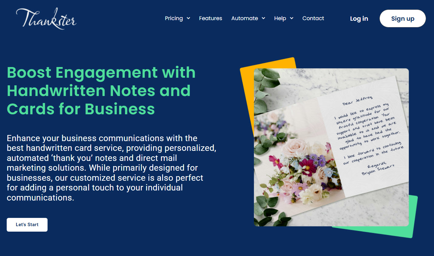 Thankster ajuda empresas e organizações sem fins lucrativos a automatizar correspondências diretas personalizadas, especialmente para enviar cartões ou notas manuscritas a clientes ou doadores.