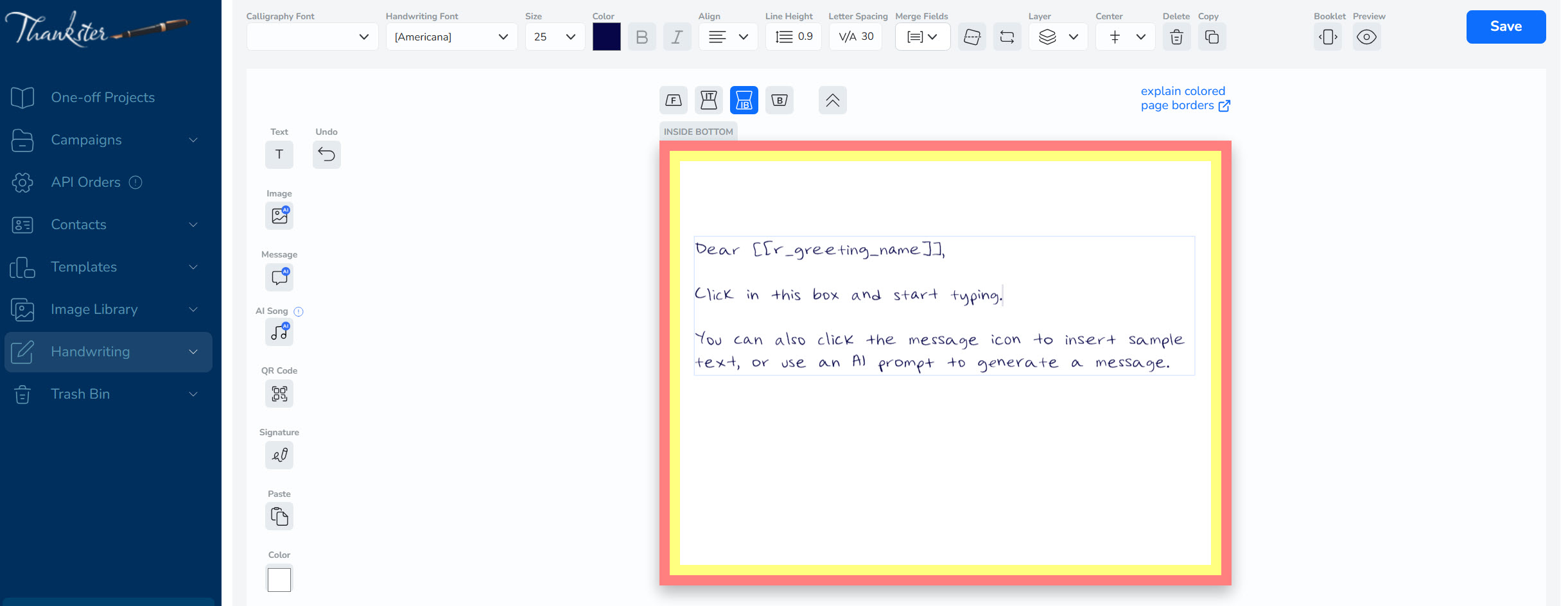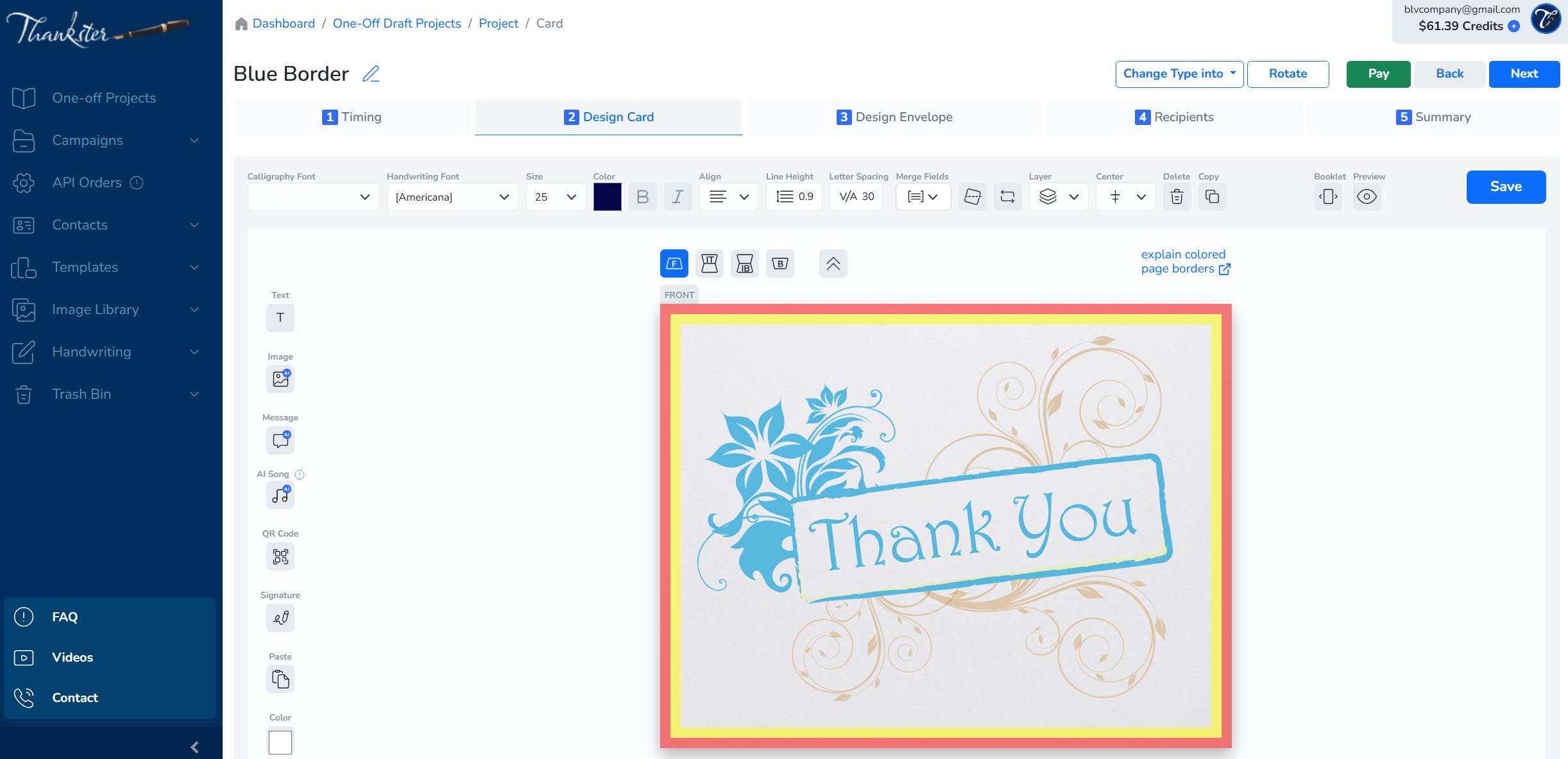 Thankster ajuda empresas e organizações sem fins lucrativos a automatizar correspondências diretas personalizadas, especialmente para enviar cartões ou notas manuscritas para clientes ou doadores. Nota: Embora projetado principalmente para empresas, nosso serviço personalizado também é perfeito para adicionar um toque pessoal às suas comunicações individuais. * Complementa Estratégias Digitais - Campanhas com taxas de abertura mais altas que são mais duradouras e surpreendem e encantam. * Caligrafia Autêntica - Escolha um dos nossos muitos estilos (com variação de caracteres) ou crie o seu próprio. Nossa solução de caligrafia usa técnicas sutis para autenticidade (use um dos nossos ou crie o seu próprio). * Automatize o Envio - Configure campanhas recorrentes para aniversários, aniversários de casamento ou outras ocasiões, dentro do Thankster ou através de uma de nossas integrações (incluindo Zapier e outras plataformas semelhantes). * Ferramentas de IA para dar vida aos seus cartões enviados - Além de ferramentas de IA para suas imagens e mensagens, também permitimos que você adicione uma música personalizada e escaneável aos seus envios. * Ótimas Opções de Personalização - Nosso editor oferece grande flexibilidade ao criar seus envios, e você pode personalizar modelos através de campos de mesclagem. * Papel cartão premium e pesado - E para postagem usamos selos reais de primeira classe. E usamos selos reais de primeira classe. * Aumente a Retenção de Clientes - Imobiliário, Seguros, Hospitalidade, Vendas – praticamente qualquer empresa ou organização sem fins lucrativos pode se beneficiar. Também é ótimo para aquisição de clientes. * Economize Tempo e Dinheiro - Automatize todo o processo com nossa funcionalidade de autoatendimento ou peça nossa ajuda para projetos mais complicados. Economize com nossos planos automatizados ou pré-pagando pacotes de crédito. * Ótimas Opções de Envio - Escolha uma das nossas ou crie a sua própria. Pasta, plano, cartões postais e cartas disponíveis. * Rápida Execução - Para pedidos típicos, geralmente enviamos dentro de 1-2 dias úteis. * Serviço Abrangente - Nós imprimimos, embalamos, selamos e enviamos para você. Envie imediatamente ou agende para mais tarde.