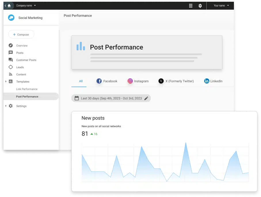 Agende postagens ilimitadas, gerencie redes sociais, acompanhe conversas e meça o desempenho a partir de um único painel.