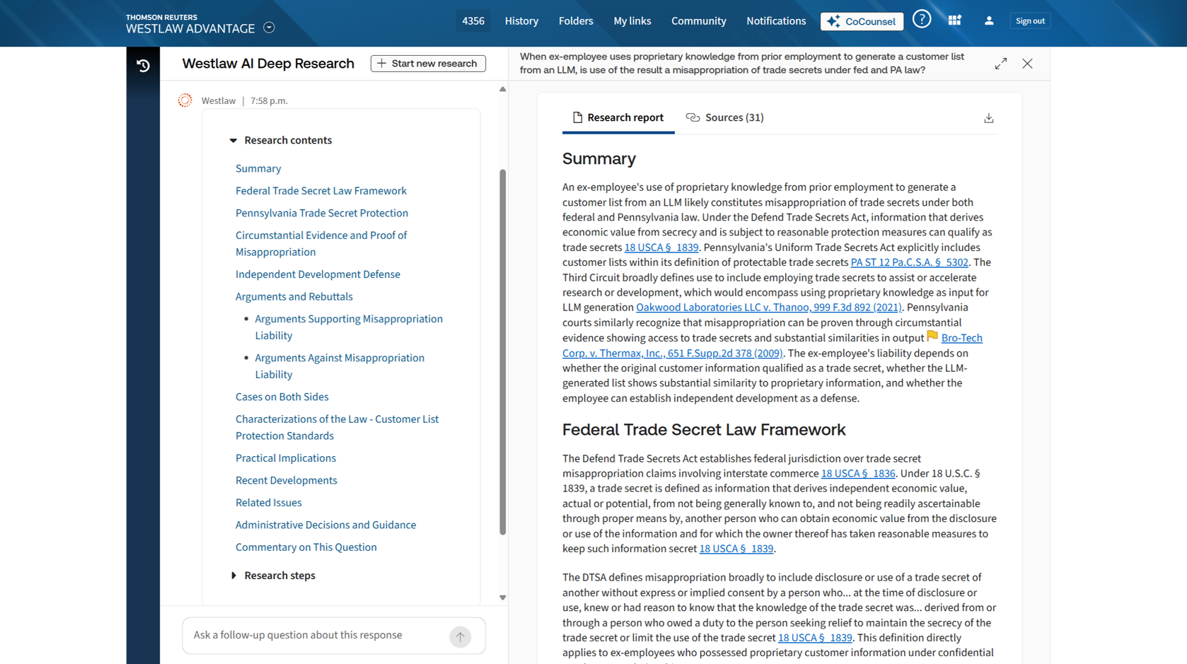 A última versão, Westlaw Advantage, aprimora a experiência de pesquisa ao integrar poderosas ferramentas de pesquisa jurídica que permitem aos profissionais do direito obter resultados completos e precisos. Um de seus recursos de destaque, o Deep Research, permite que os usuários emulem o fluxo de trabalho de um pesquisador jurídico experiente utilizando IA agente. Esta ferramenta formula e executa um plano de pesquisa em várias etapas que explora todos os ângulos de uma questão jurídica, fornecendo uma abordagem passo a passo transparente e um relatório abrangente que se liga a fontes autorizadas. Esta capacidade garante que os usuários não apenas recebam resultados confiáveis, mas também obtenham insights que poderiam ser ignorados de outra forma.
