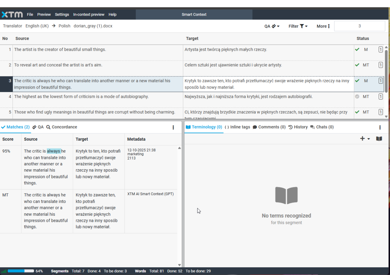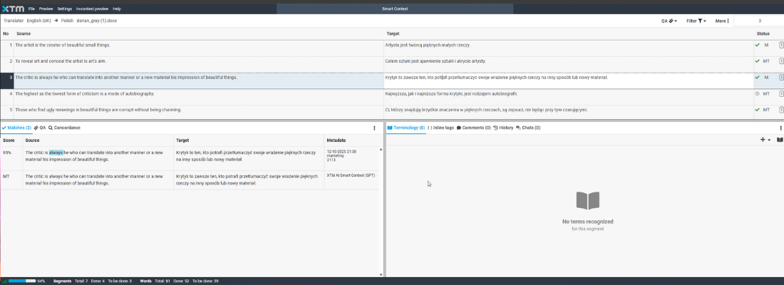 Os principais recursos da XTM incluem ferramentas impulsionadas por IA, como Intelligent Score para pontuação automatizada de qualidade de tradução, Language Guard para detecção de linguagem prejudicial e SmartContext para tradução de IA consistente com a marca. Além disso, a plataforma oferece memória de tradução avançada com correspondência inteligente, recuperação de subsegmentos e priorização de TM para maximizar o reuso de conteúdo e minimizar custos. Recursos de contexto visual permitem que linguistas traduzam no contexto com pré-visualizações ao vivo, o que reduz significativamente os ciclos de revisão e a necessidade de pós-edição.