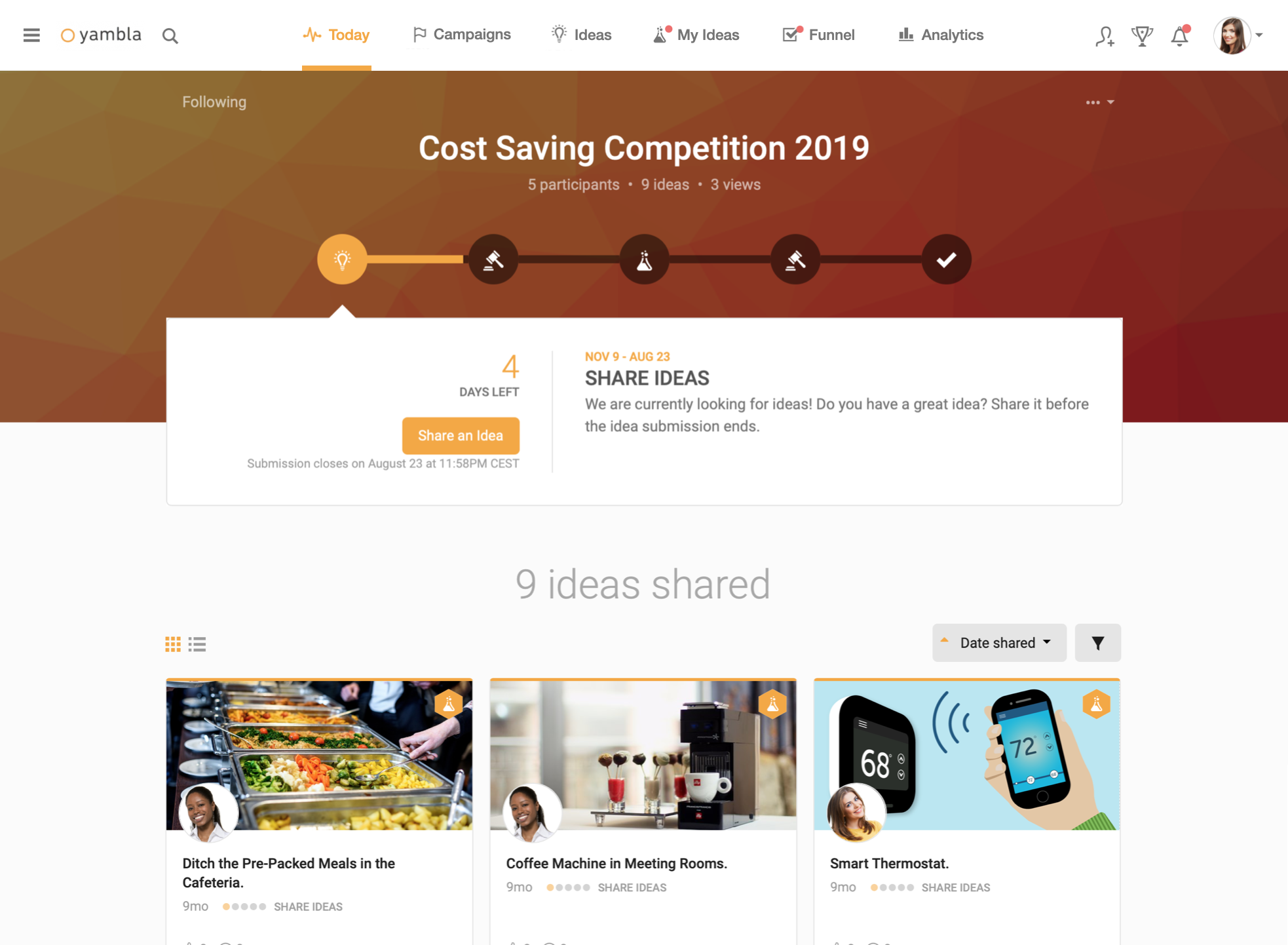 Yambla é a ferramenta perfeita para aproveitar o potencial criativo e inovador da organização. Ela cria o máximo engajamento no desenvolvimento de ideias ao oferecer uma interface de usuário sem esforço. Além disso, contém todas as análises necessárias para demonstrar resultados! Análise coletada por e hospedada no G2.com.
