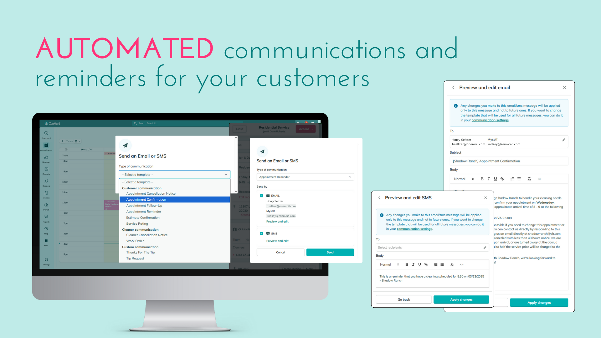 O ZenMaid nos ajudou a resolver esses problemas e mais, o que nos permitiu dobrar o tamanho do nosso negócio no último ano. Adoramos que nossos clientes recorrentes regulares sejam automaticamente agendados no ZenMaid. Tudo o que precisamos fazer é adicionar o cliente e seus detalhes, selecionar a frequência de limpeza (semanal, a cada 2 semanas, a cada 3 semanas, etc.) e, em seguida, atribuir sua equipe - o ZenMaid faz o resto, agendando o compromisso e enviando todos os maravilhosos lembretes e ordens de serviço para clientes e funcionários!